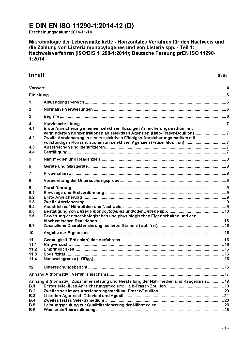 Mikrobiologie von Lebensmitteln und Futtermitteln - Horizontales Verfahren für den Nachweis und die Zählung von Listeria monocytogenes - Teil 1: Nachweisverfahren (ISO/DIS 11290-1:1995); Deutsche Fassung prEN ISO 11290-1:1995