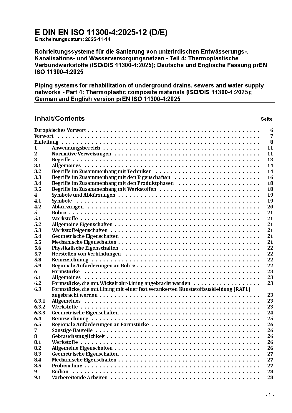 Rohrleitungssysteme für die Sanierung von unterirdischen Entwässerungs-, Kanalisations- und Wasserversorgungsnetzen - Teil 4: Thermoplastische Verbundwerkstoffe (ISO/DIS 11300-4:2025); Deutsche und Englische Fassung prEN ISO 11300-4:2025