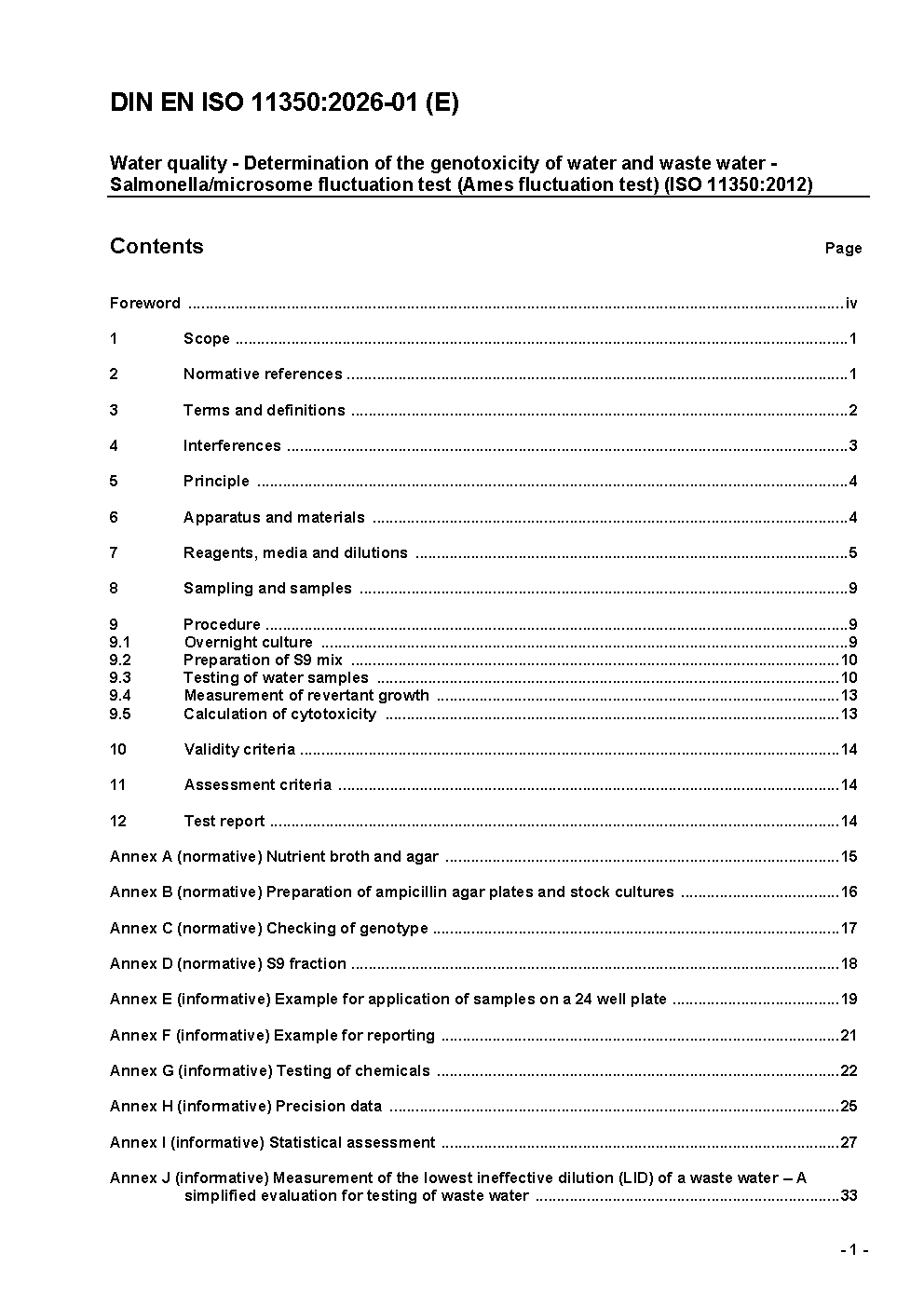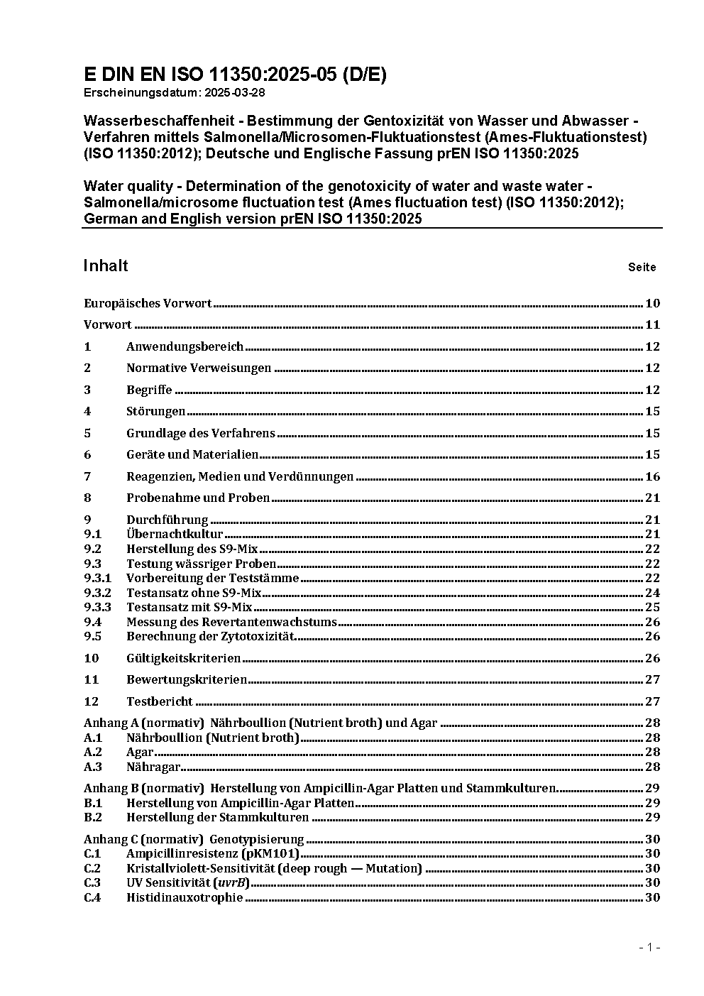 Wasserbeschaffenheit - Bestimmung der Gentoxizität von Wasser und Abwasser - Verfahren mittels Salmonella/Microsomen-Fluktuationstest (Ames-Fluktuationstest) (ISO 11350:2012); Deutsche und Englische Fassung prEN ISO 11350:2025