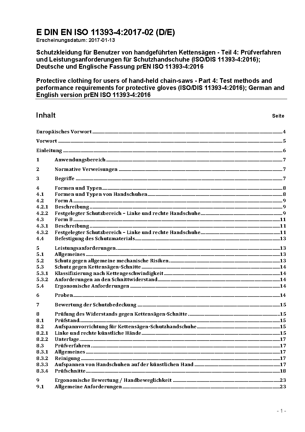 Schutzkleidung für Benutzer von handgeführten Kettensägen - Teil 4: Prüfverfahren und Leistungsanforderungen für Schutzhandschuhe (ISO/DIS 11393-4:2016); Deutsche und Englische Fassung prEN ISO 11393-4:2016
