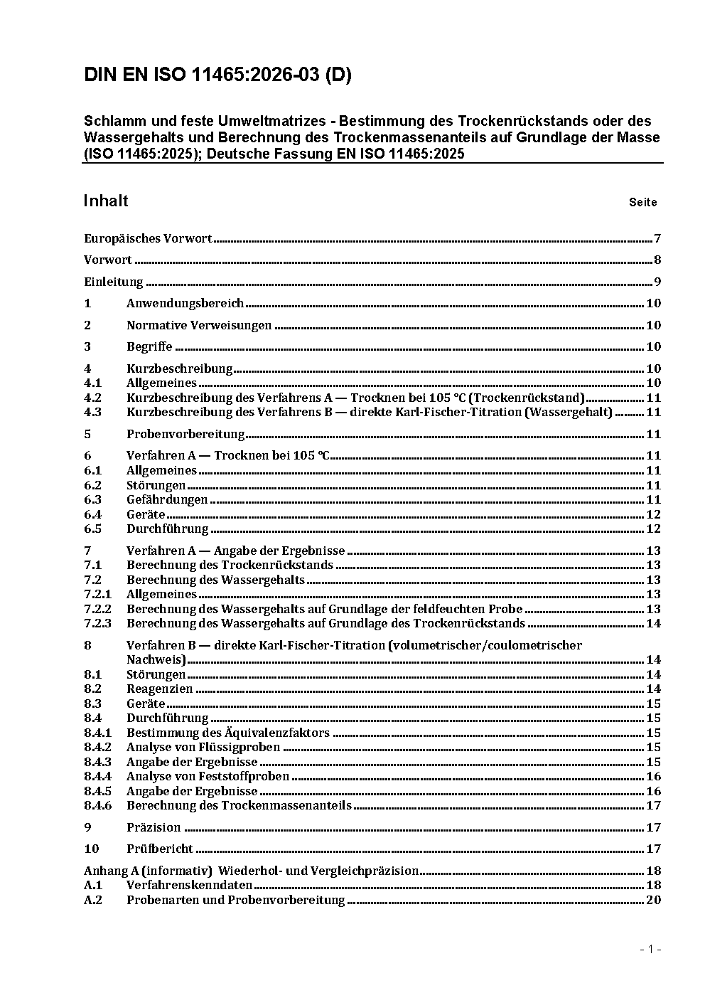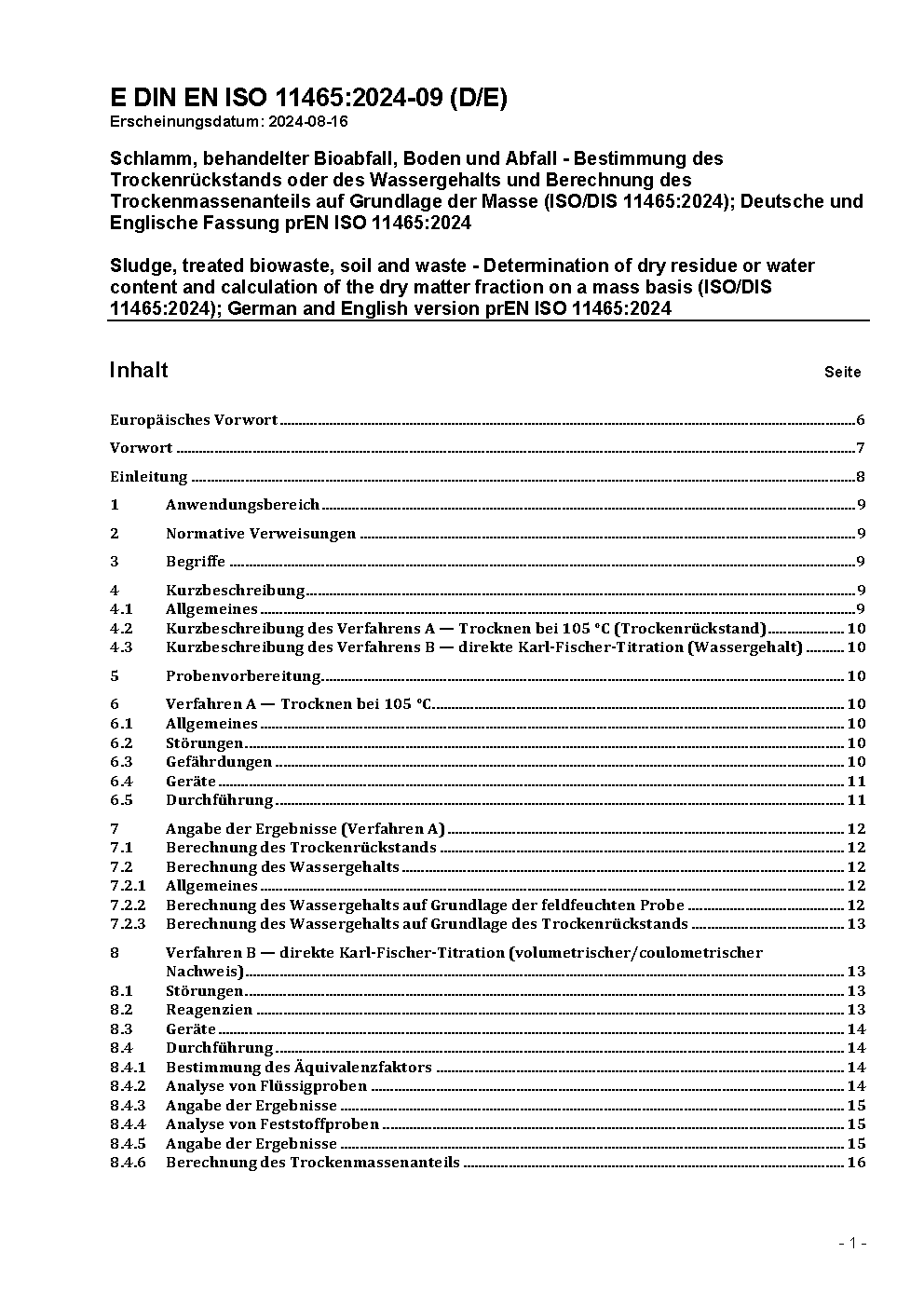Schlamm, behandelter Bioabfall, Boden und Abfall - Bestimmung des Trockenrückstands oder des Wassergehalts und Berechnung des Trockenmassenanteils auf Grundlage der Masse (ISO/DIS 11465:2024); Deutsche und Englische Fassung prEN ISO 11465:2024