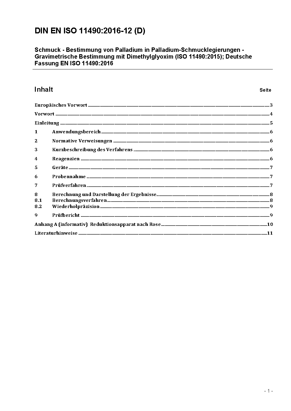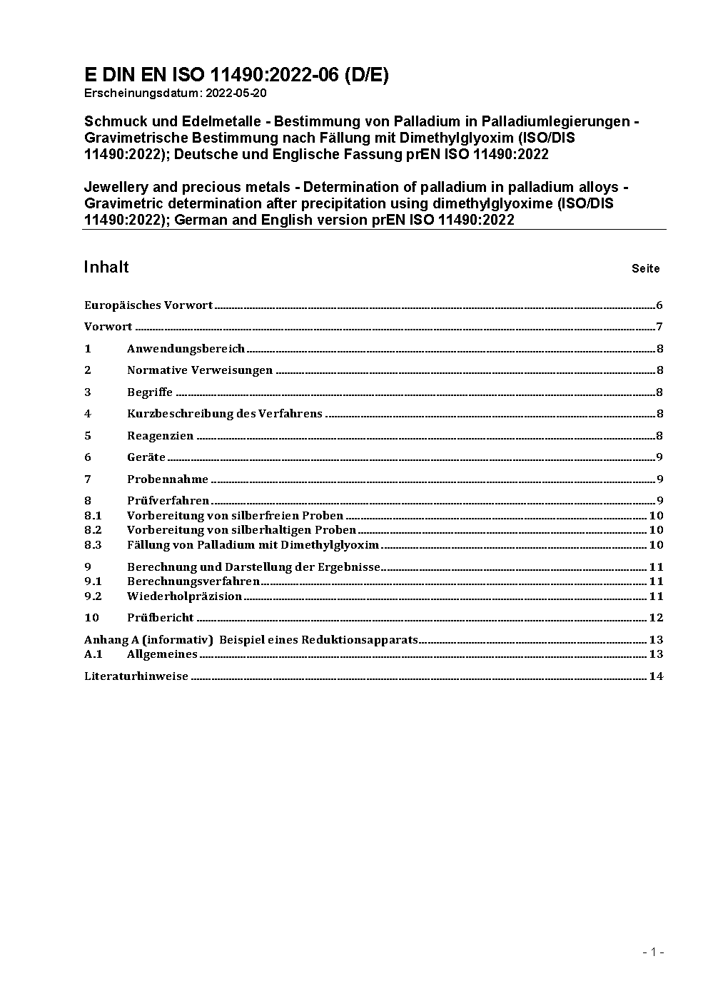 Schmuck - Bestimmung von Palladium in Palladium-Schmucklegierungen - Gravimetrische Bestimmung mit Dimethylglyoxim (ISO 11490:2014); Deutsche und Englische Fassung prEN ISO 11490:2016