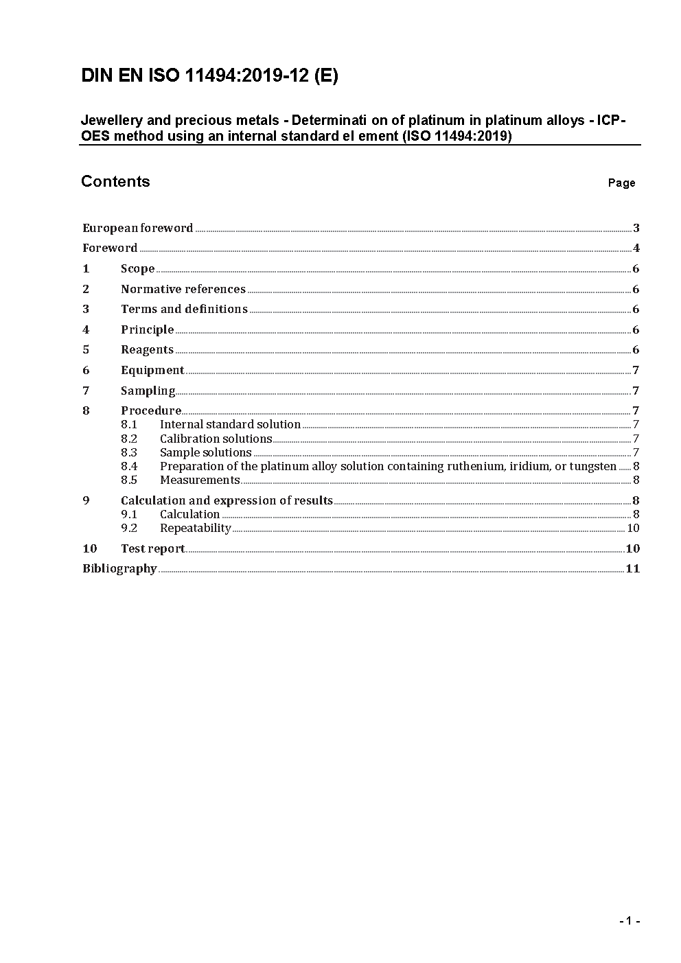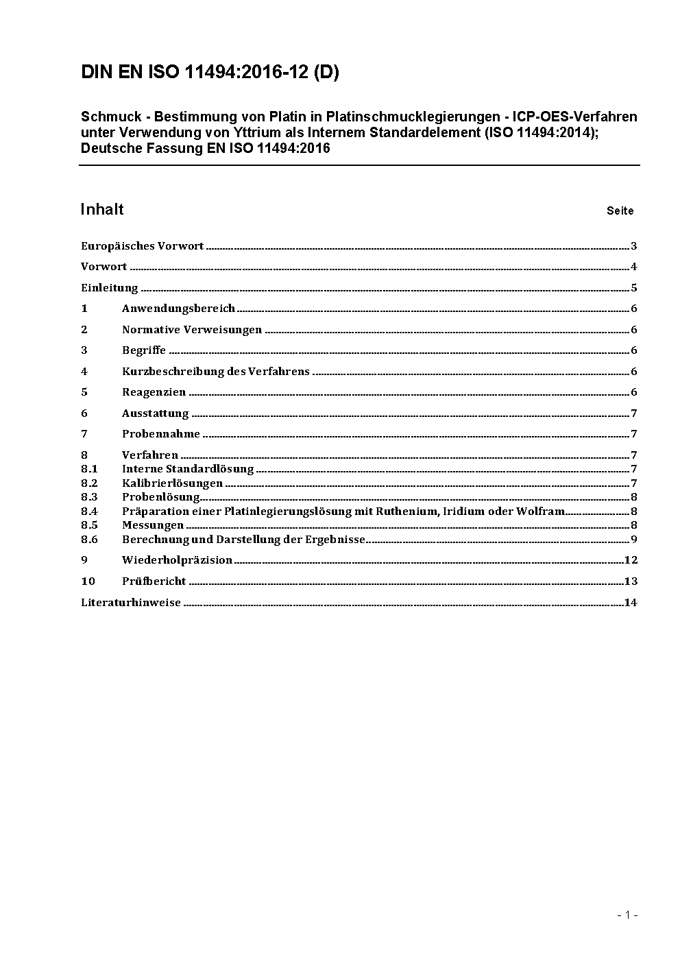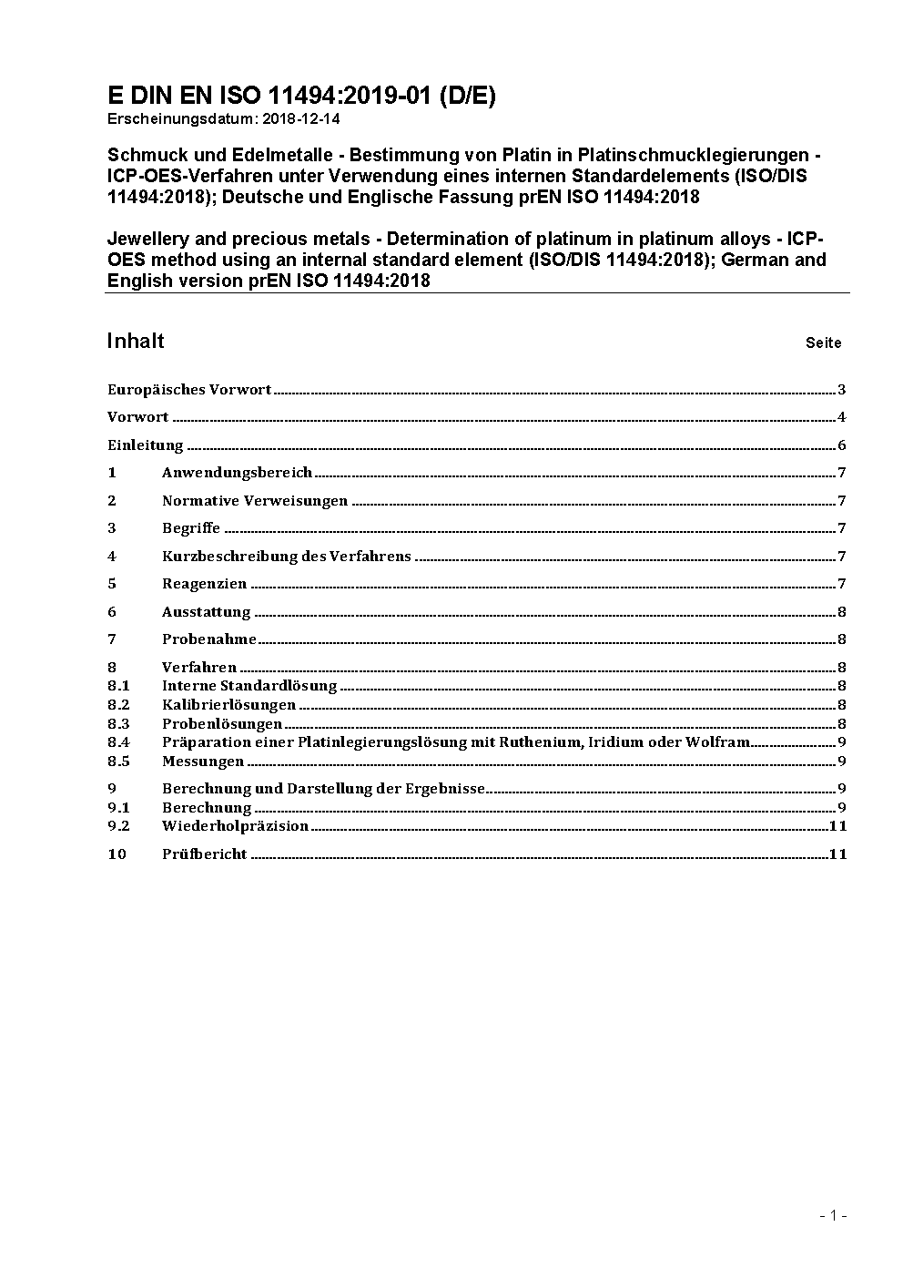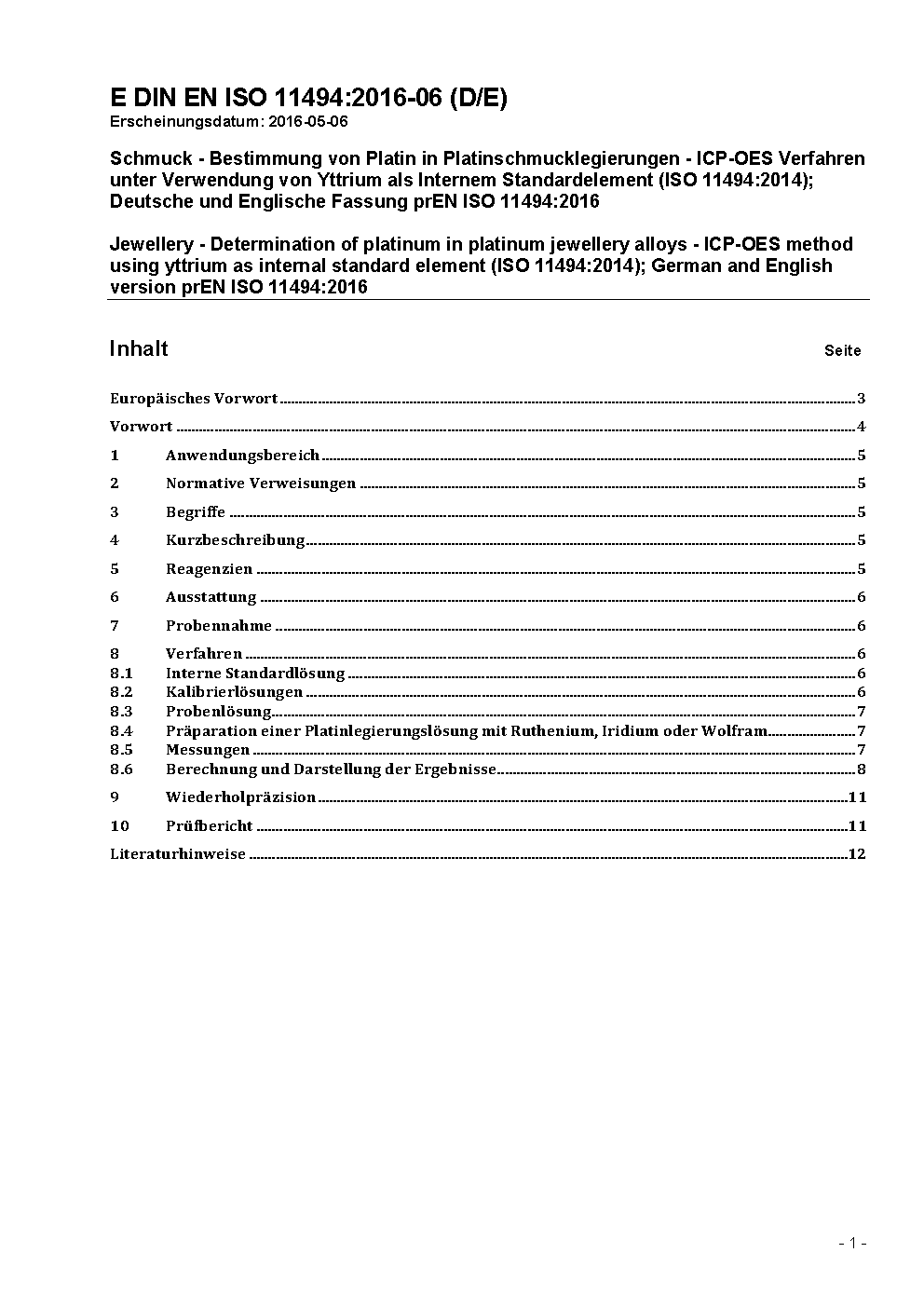 Schmuck - Bestimmung von Platin in Platinschmucklegierungen - ICP-OES Verfahren unter Verwendung von Yttrium als Internem Standardelement (ISO 11494:2014); Deutsche und Englische Fassung prEN ISO 11494:2016