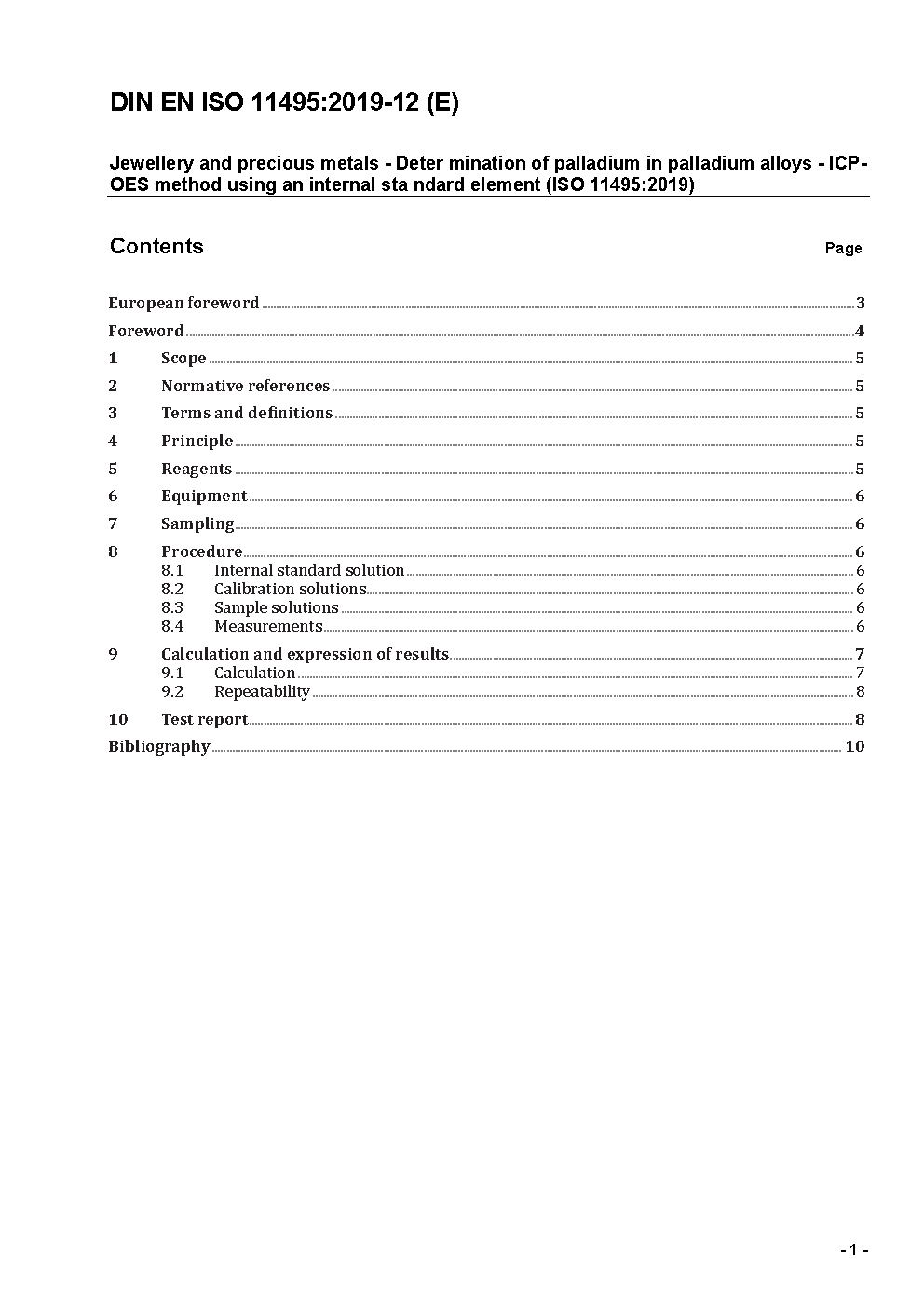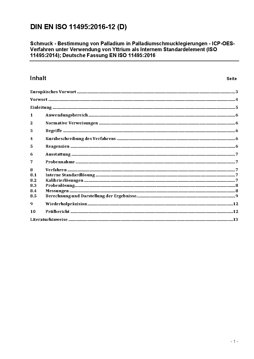Schmuck - Bestimmung von Palladium in Palladiumschmucklegierungen - ICP-OES Verfahren unter Verwendung von Yttrium als Internem Standardelement (ISO 11495:2014); Deutsche und Englische Fassung prEN ISO 11495:2016