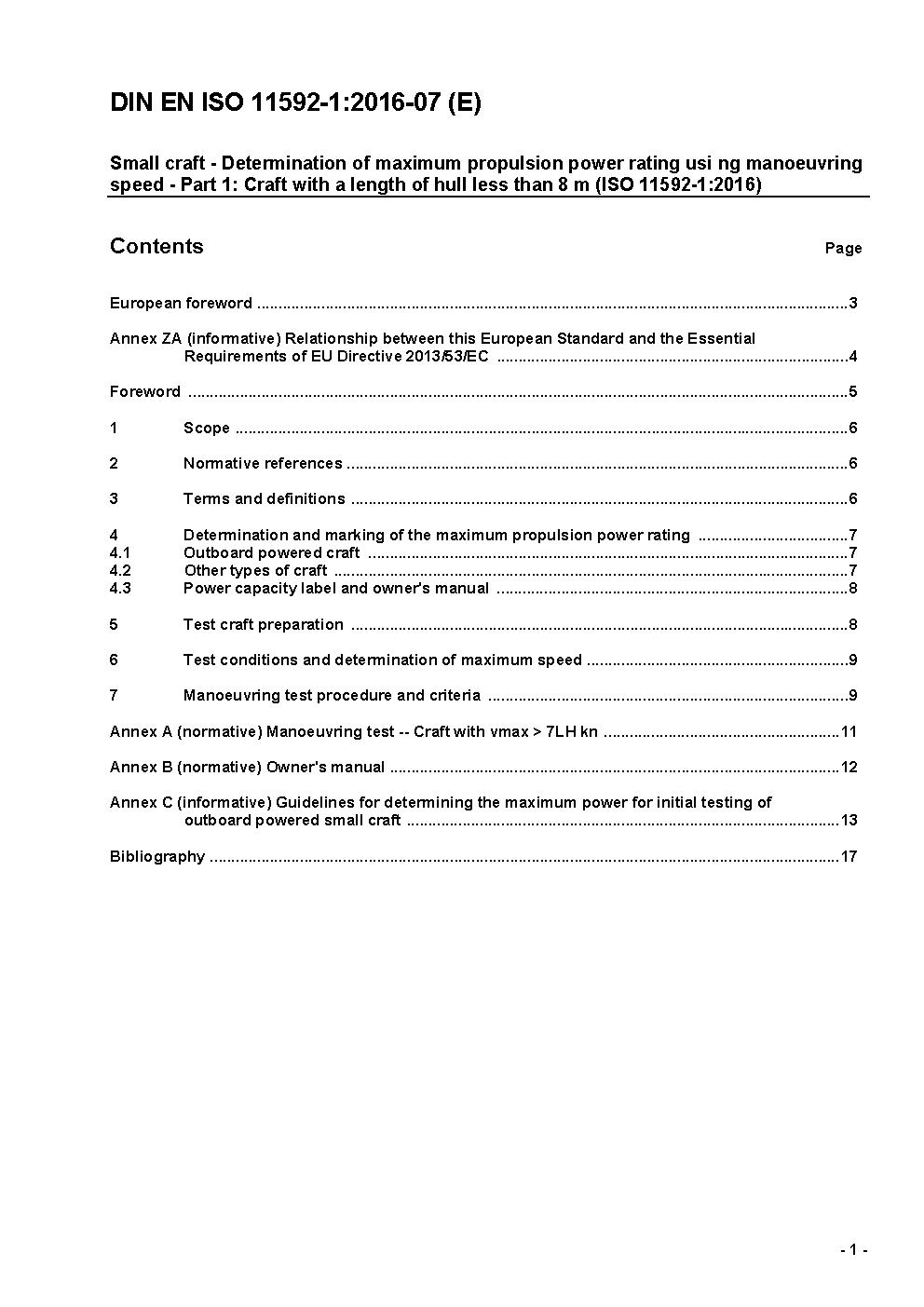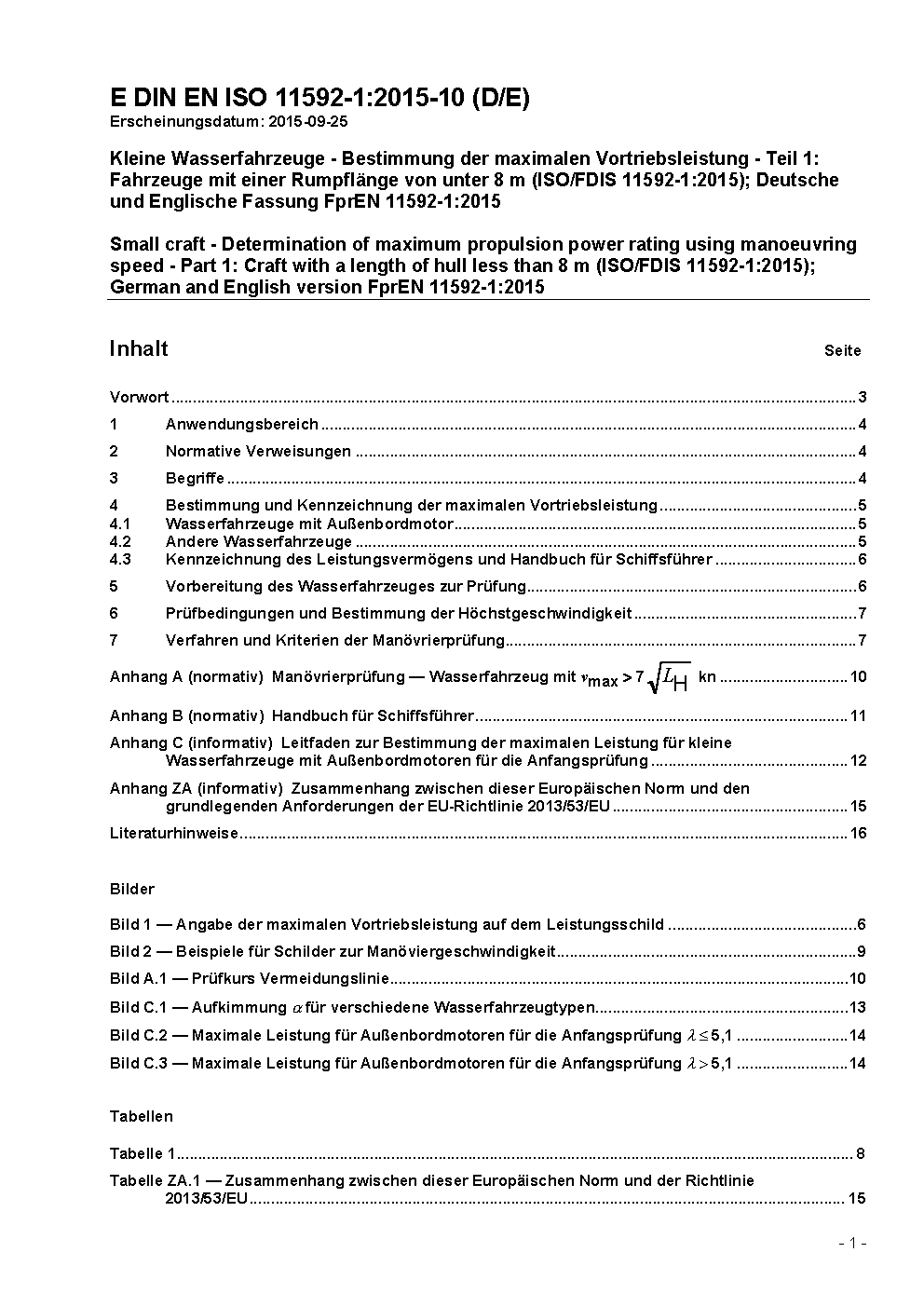 Small craft - Determination of maximum propulsion power rating using manoeuvring speed - Part 1: Craft with a length of hull less than 8 m (ISO/FDIS 11592-1:2015); German and English version FprEN ISO 11592-1:2015