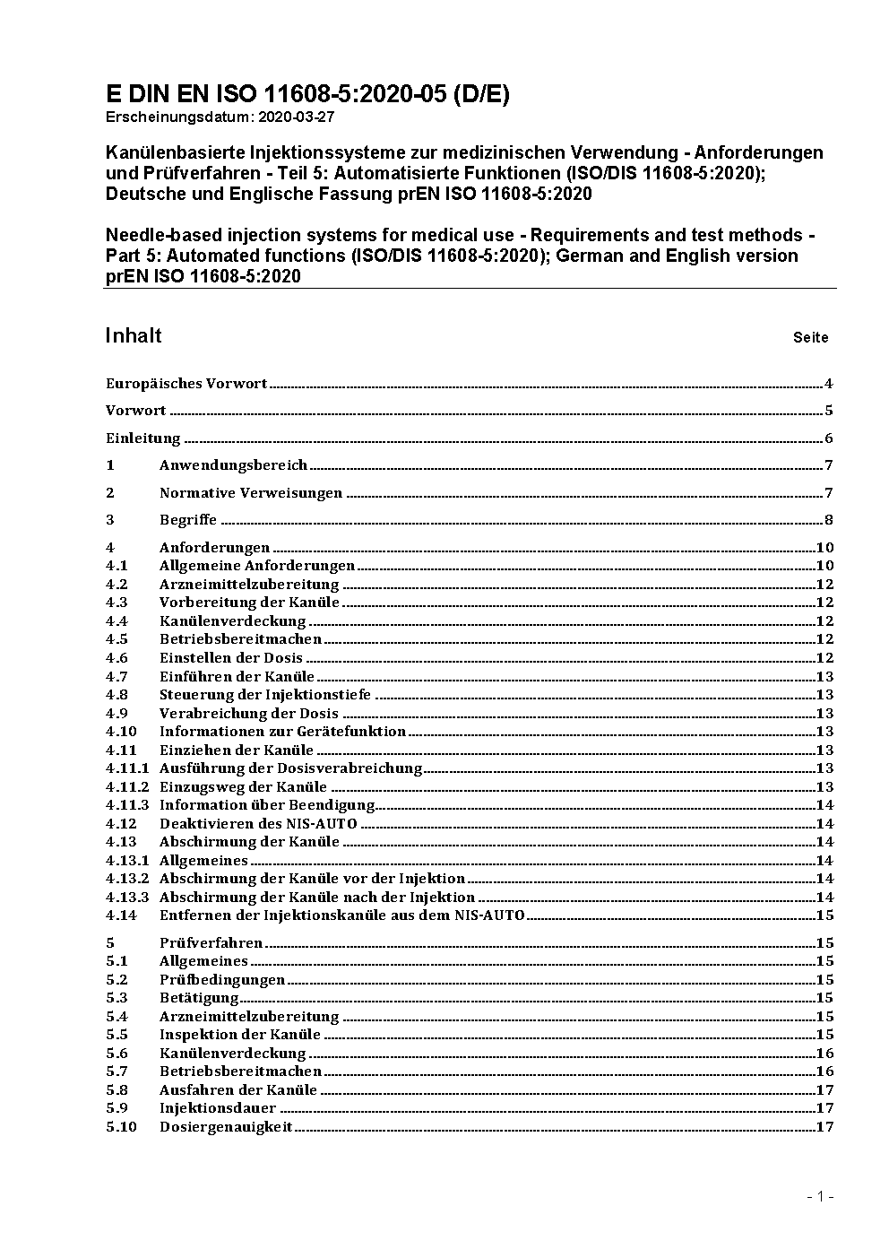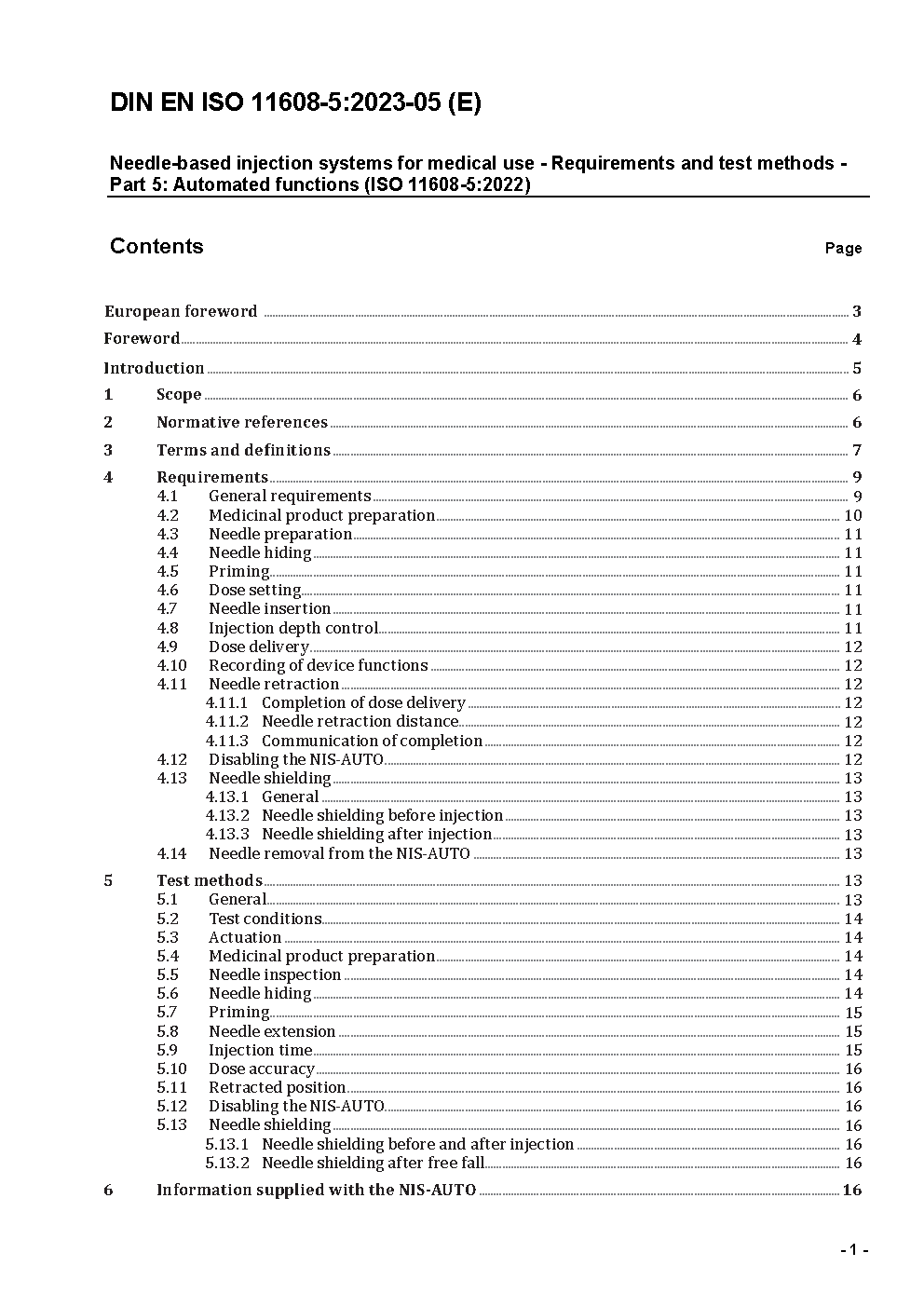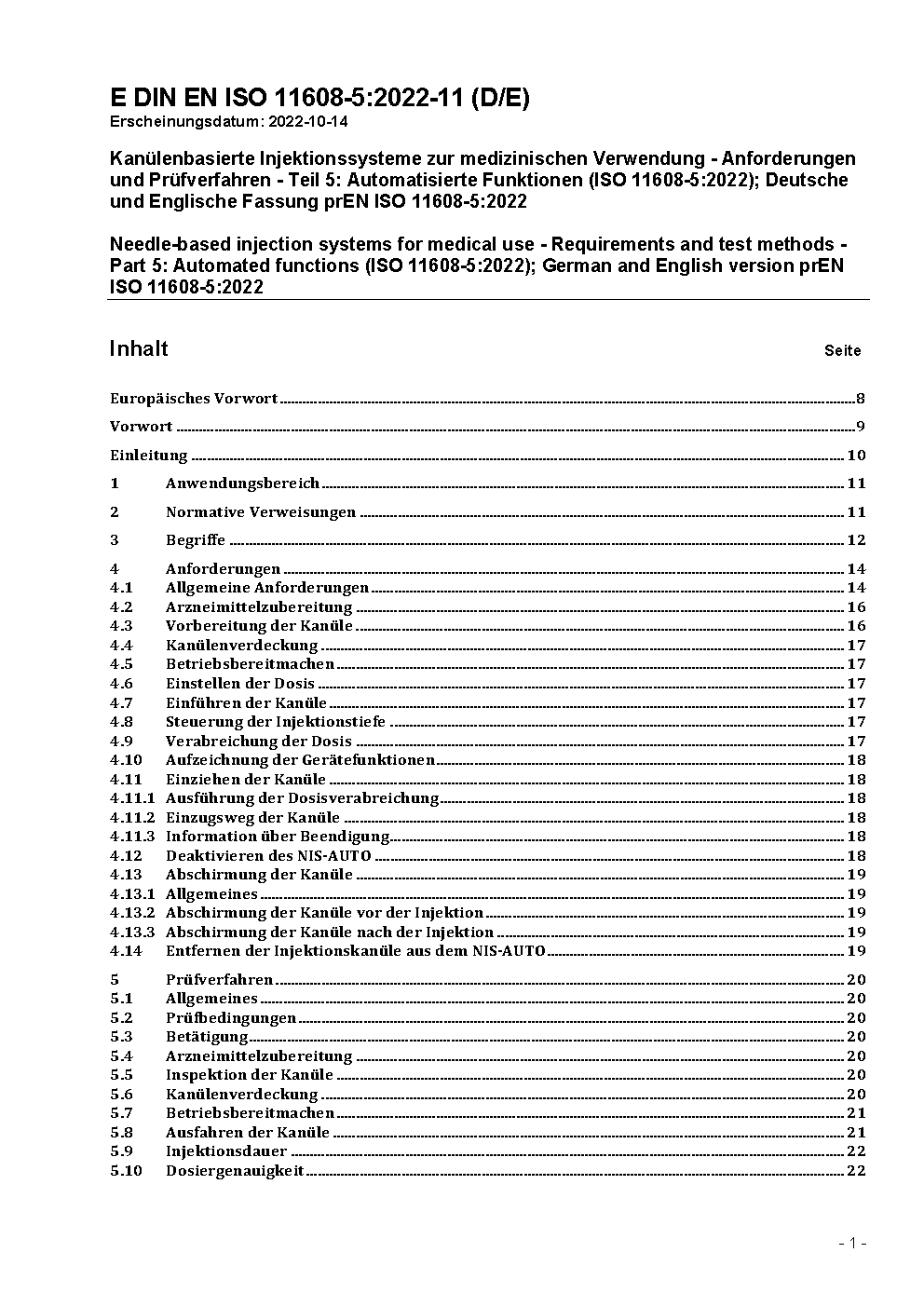 Needle-based injection systems for medical use - Requirements and test methods - Part 5: Automated functions (ISO 11608-5:2022); German and English version prEN ISO 11608-5:2022
