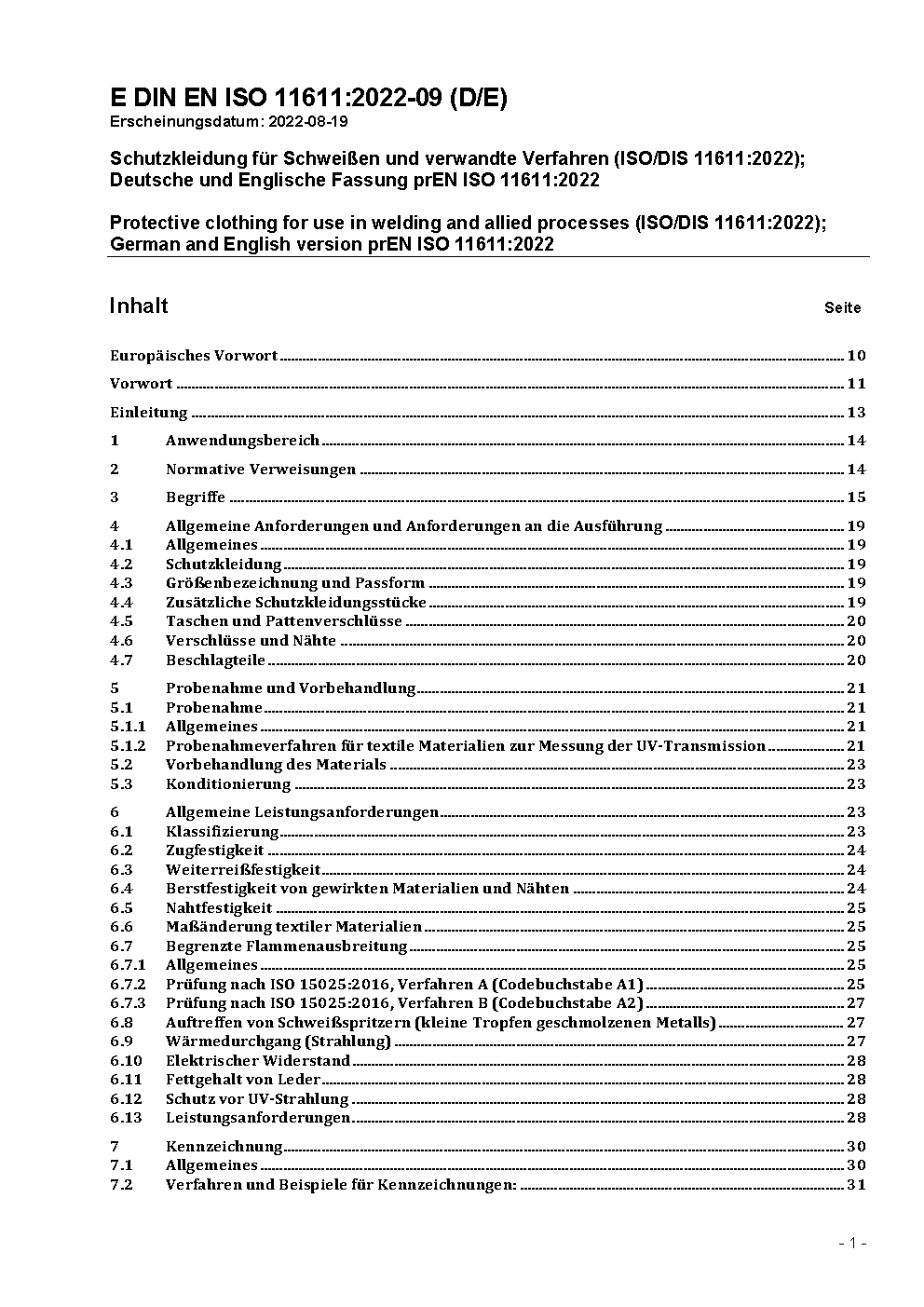 Protective clothing for use in welding and allied processes (ISO/DIS 11611:2022); German and English version prEN ISO 11611:2022