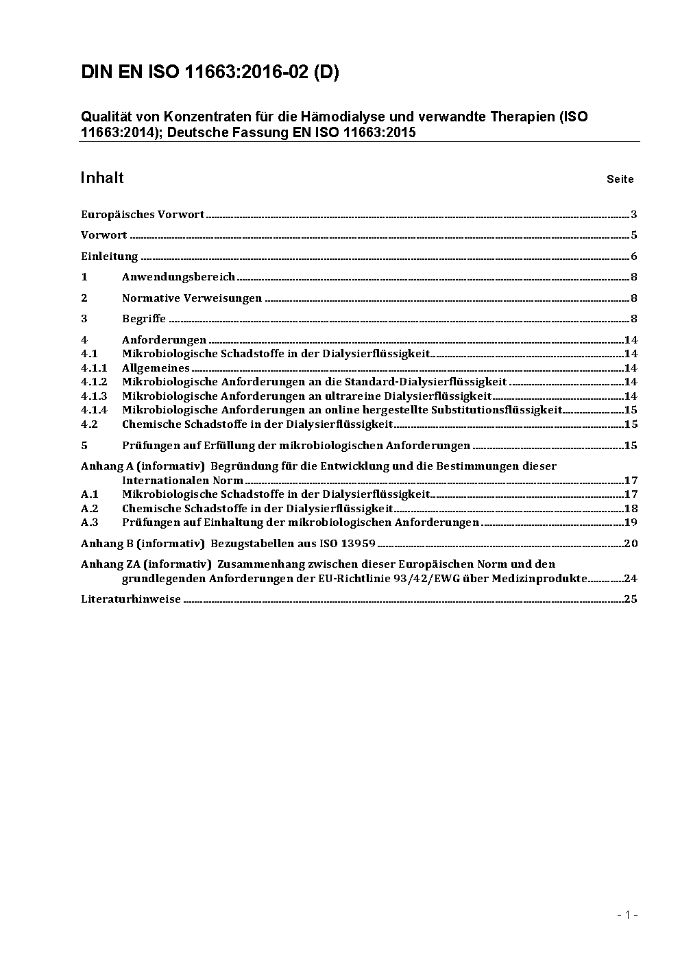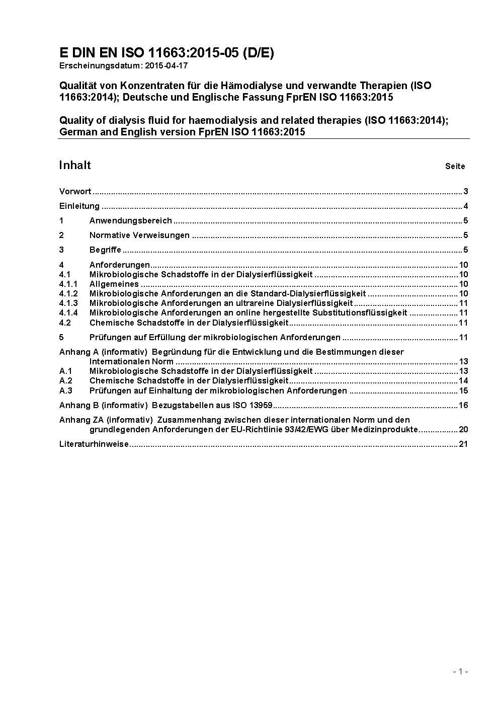Quality of dialysis fluid for haemodialysis and related therapies (ISO 11663:2014); German and English version FprEN ISO 11663:2015