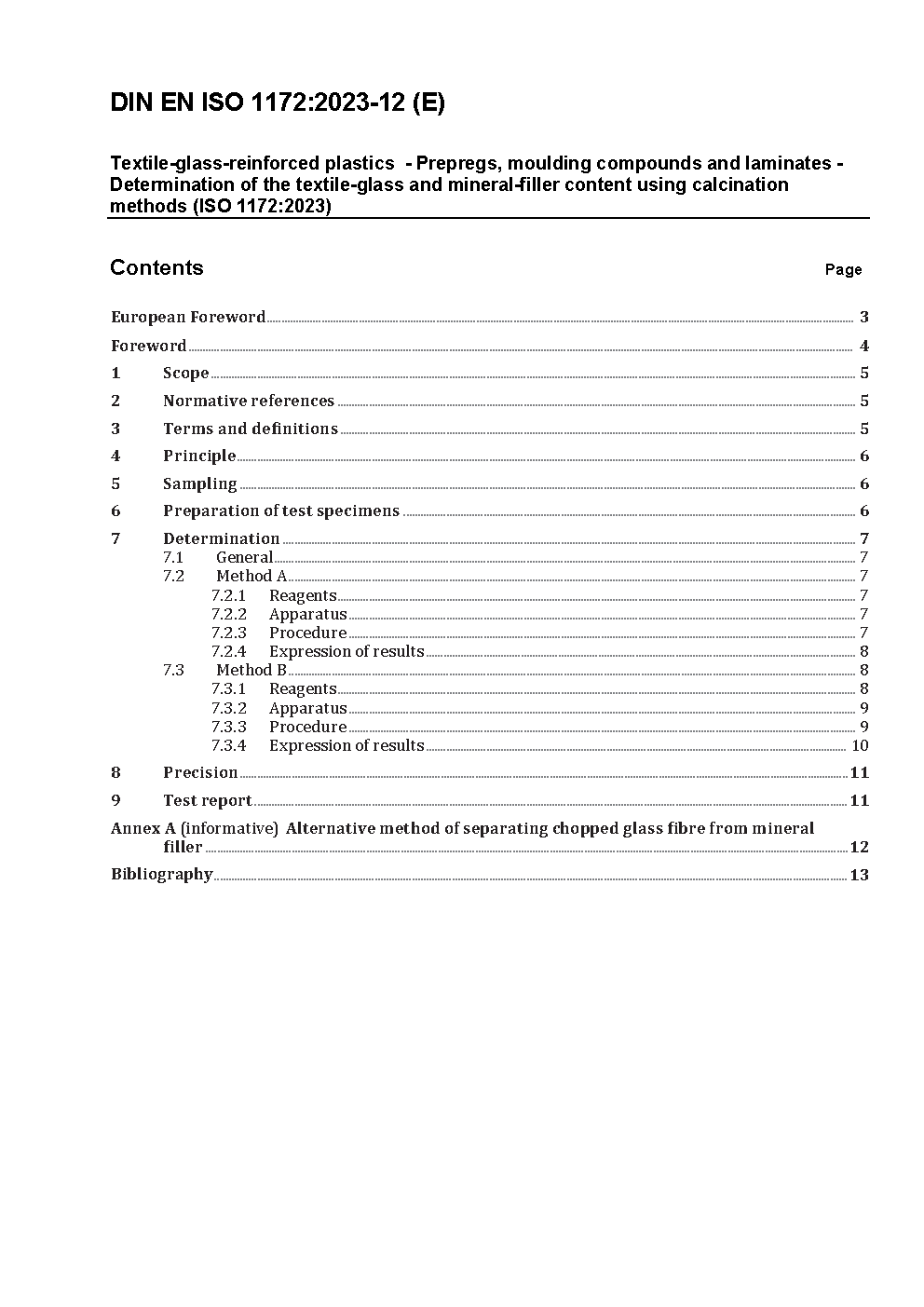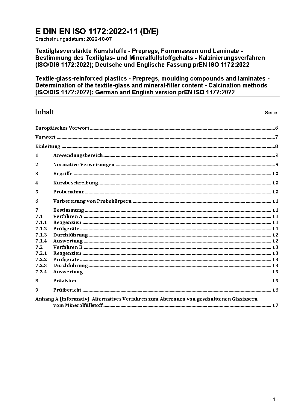 Textile-glass-reinforced plastics - Prepregs, moulding compounds and laminates - Determination of the textile-glass and mineral-filler content; calcination methods (ISO 1172:1996); German version EN ISO 1172:1998