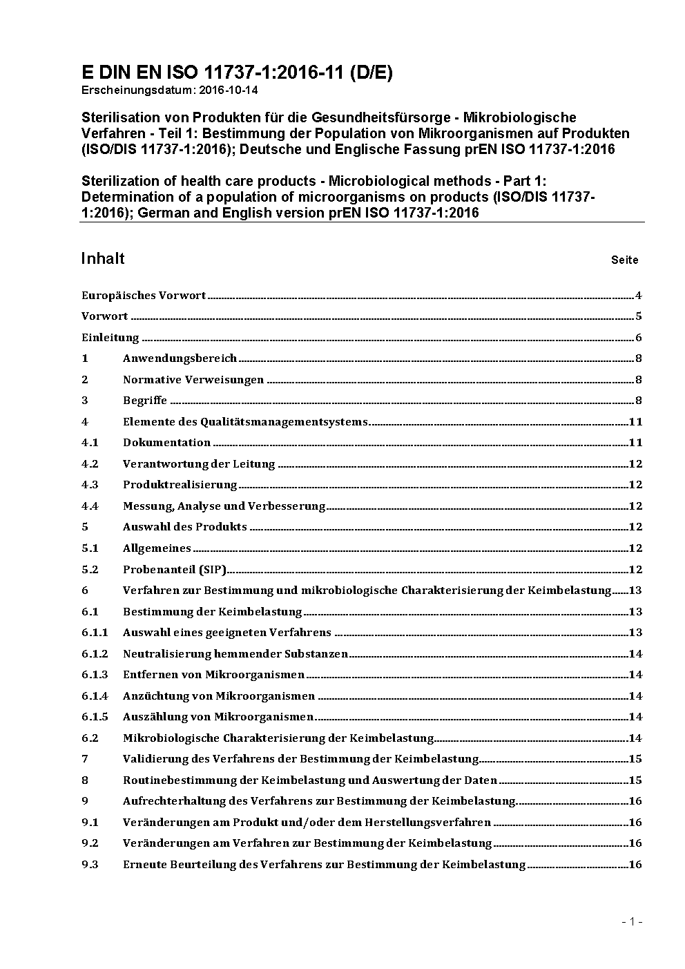 Sterilisation von Produkten für die Gesundheitsfürsorge - Mikrobiologische Verfahren - Teil 1: Bestimmung der Population von Mikroorganismen auf Produkten (ISO/DIS 11737-1:2016); Deutsche und Englische Fassung prEN ISO 11737-1:2016