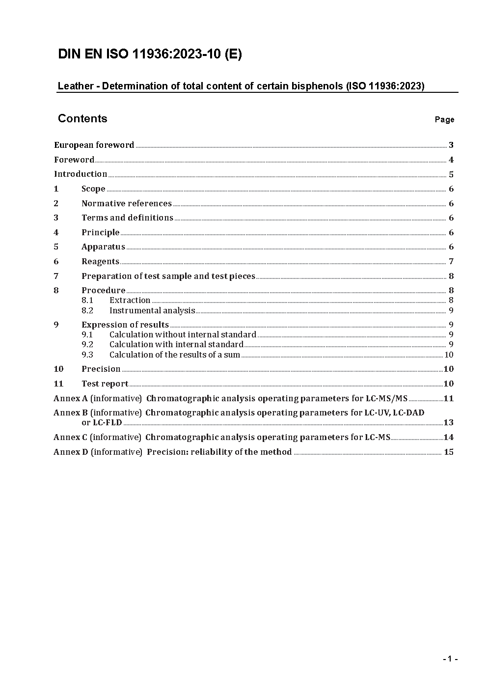 Leather - Determination of total content of certain bisphenols (ISO 11936:2023); German version EN ISO 11936:2023
