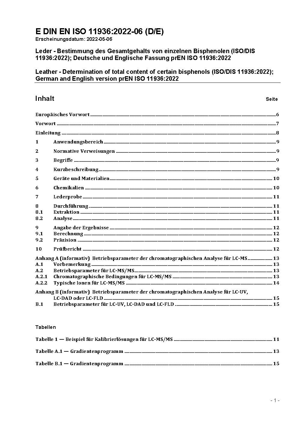 Leder - Bestimmung des Gesamtgehalts von einzelnen Bisphenolen (ISO 11936:2023); Deutsche Fassung EN ISO 11936:2023
