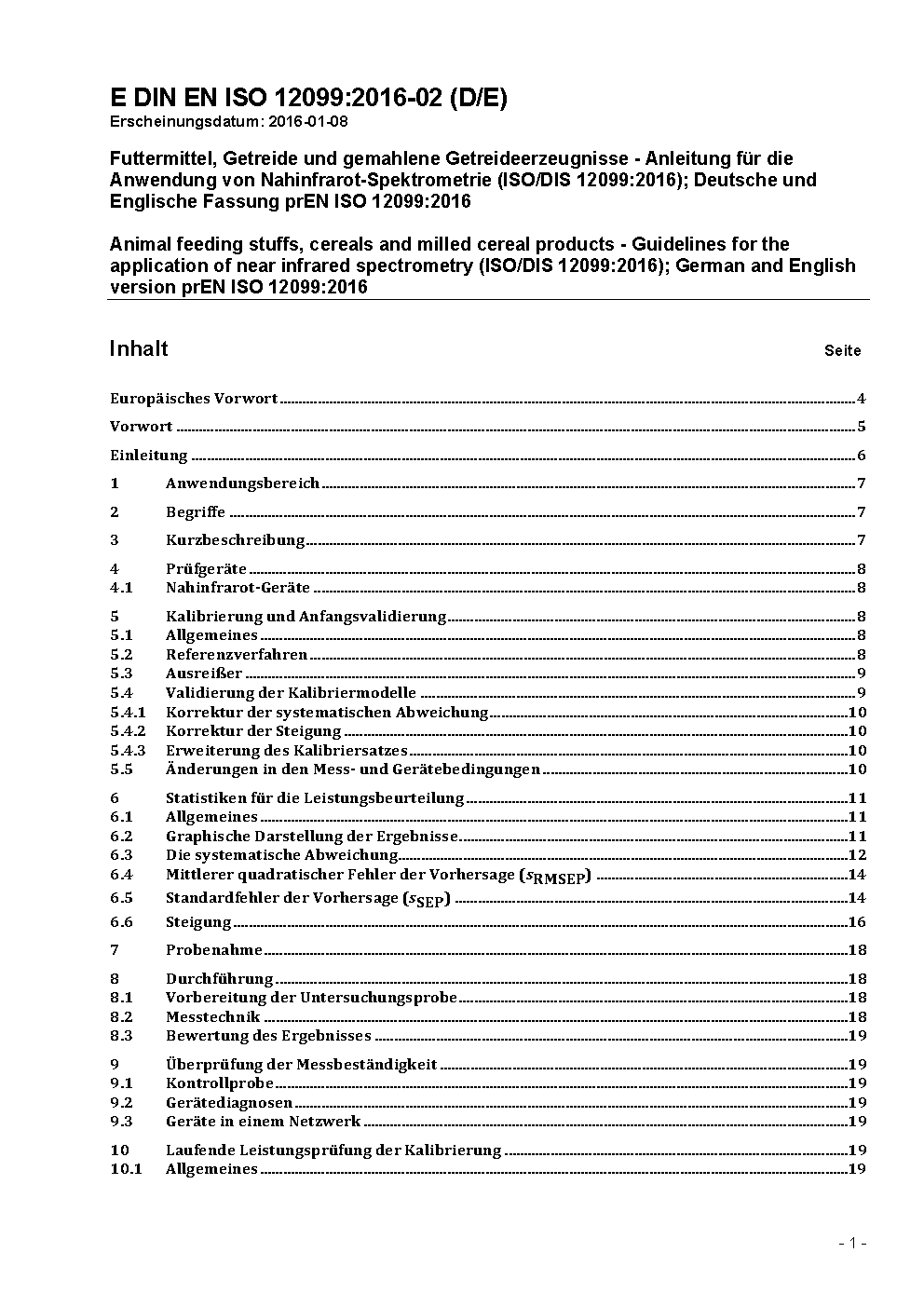 Animal feeding stuffs, cereals and milled cereal products - Guidelines for the application of near infrared spectrometry (ISO/DIS 12099:2016); German and English version prEN ISO 12099:2016