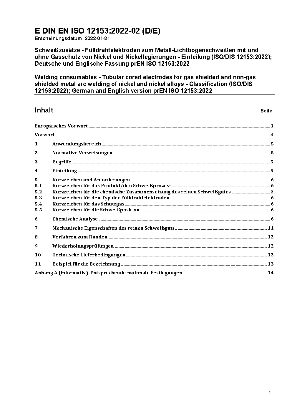 Welding consumables - Tubular-cored electrodes for gas-shielded and non-gas shielded metal arc welding of nickel and nickel alloys - Classification (ISO 12153:2022); German version EN ISO 12153:2022