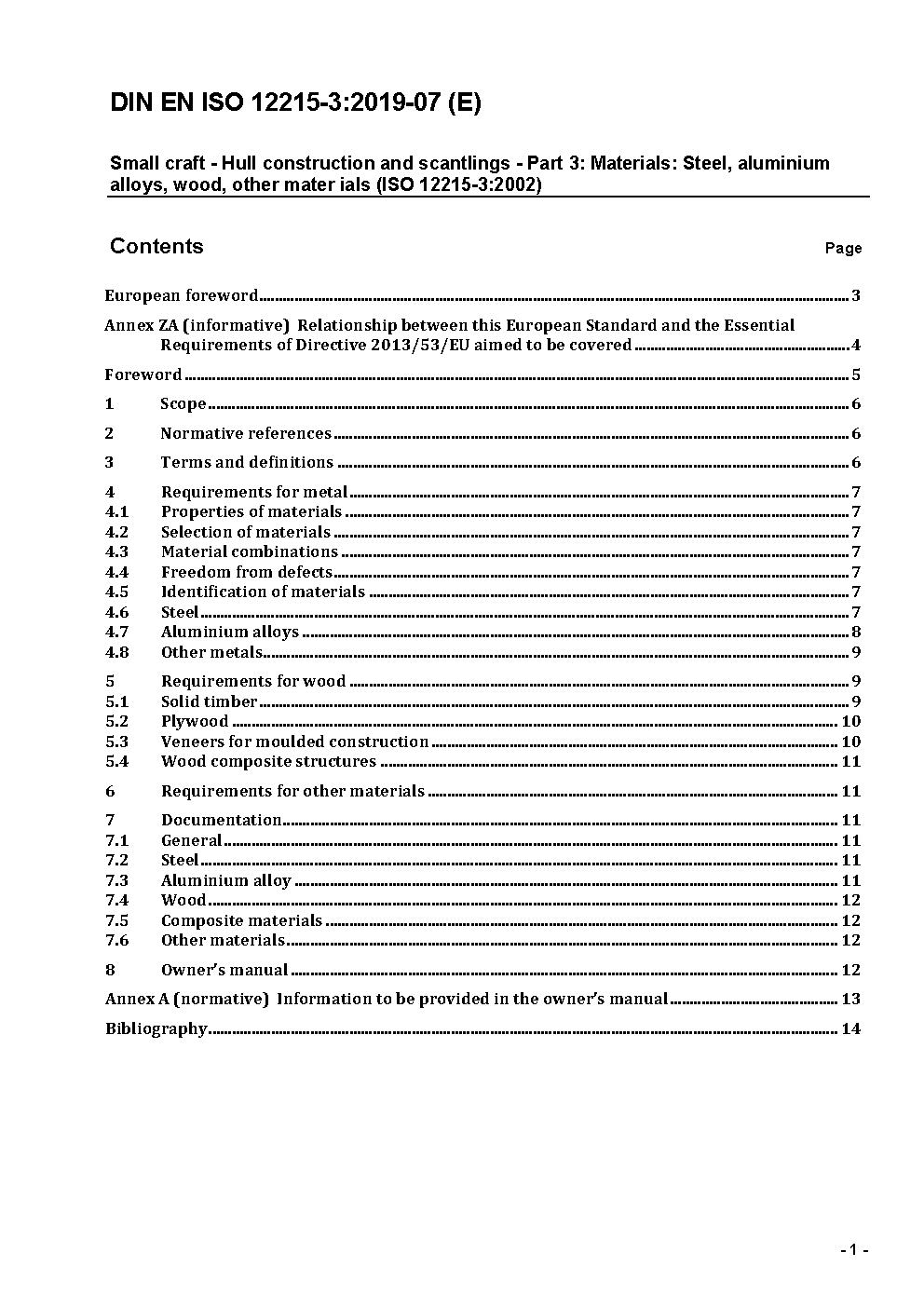 Kleine Wasserfahrzeuge - Rumpfbauweise und Dimensionierung - Teil 3: Werkstoffe: Stahl, Aluminiumlegierungen, Holz, andere Werkstoffe (ISO 12215-3:2002); Deutsche Fassung EN ISO 12215-3:2002