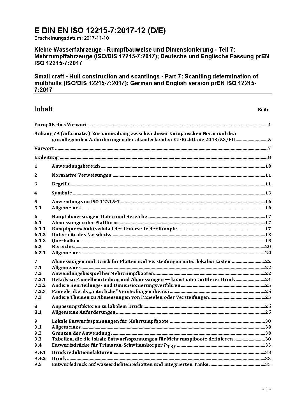 Kleine Wasserfahrzeuge - Rumpfbauweise und Dimensionierung - Teil 7: Mehrrumpffahrzeuge (ISO/DIS 12215-7:2005); Deutsche Fassung prEN ISO 12215-7:2006