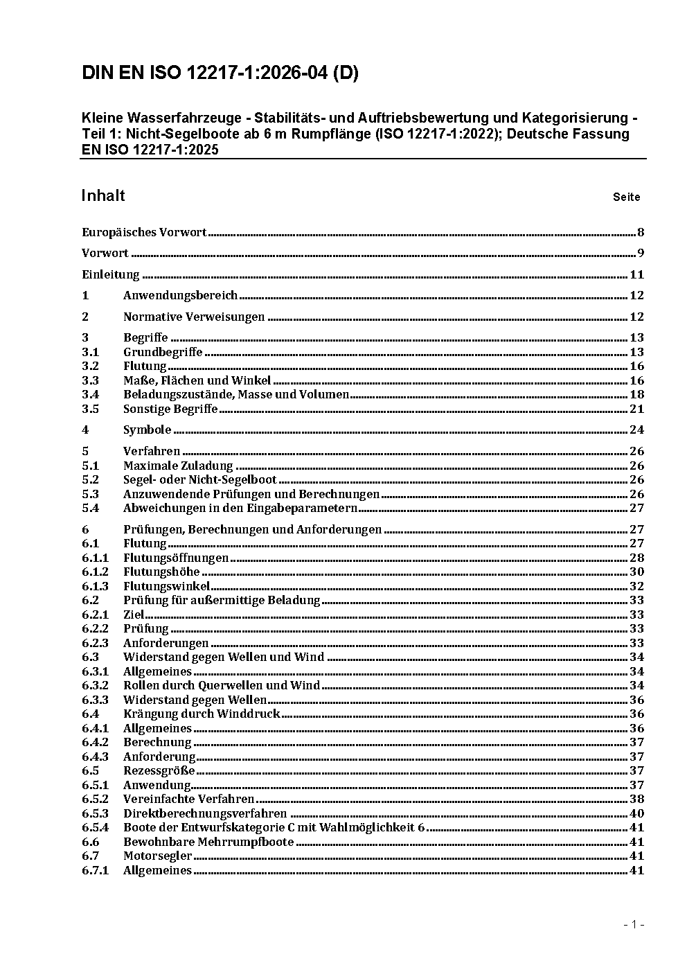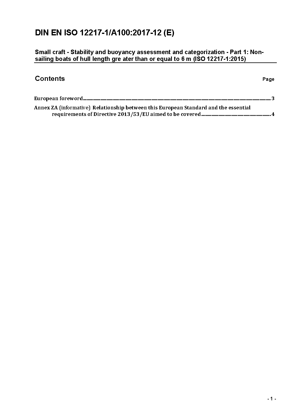 Kleine Wasserfahrzeuge - Stabilitäts- und Auftriebsbewertung und Kategorisierung - Teil 1: Nicht-Segelboote ab 6 m Rumpflänge (ISO 12217-1:2015); Deutsche Fassung EN ISO 12217-1:2015