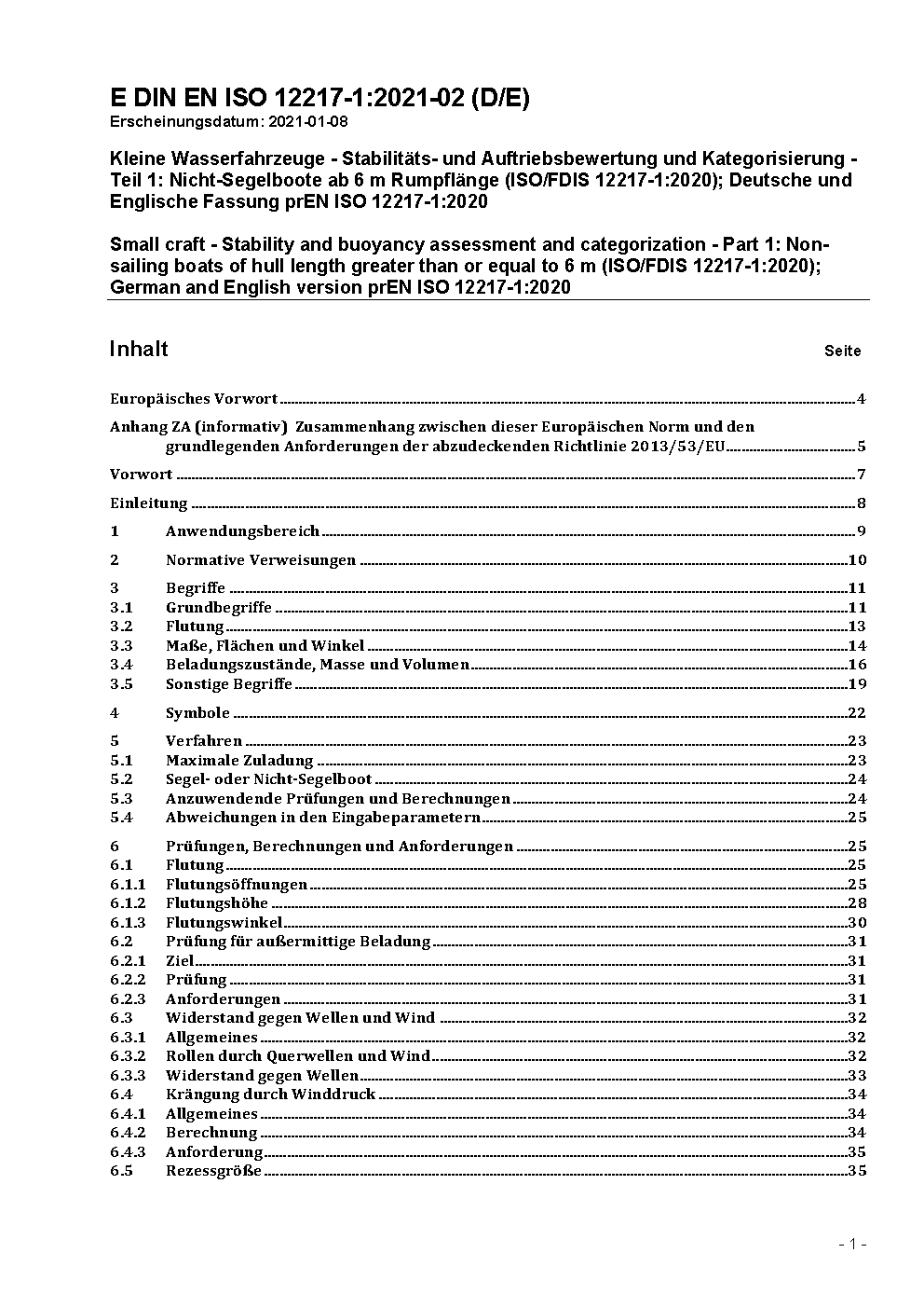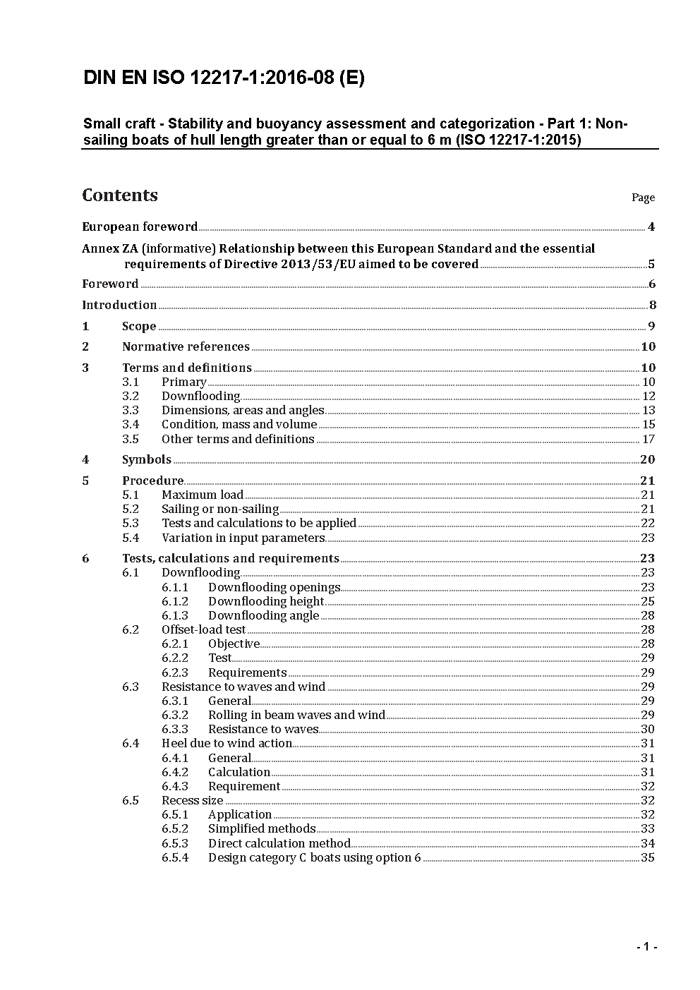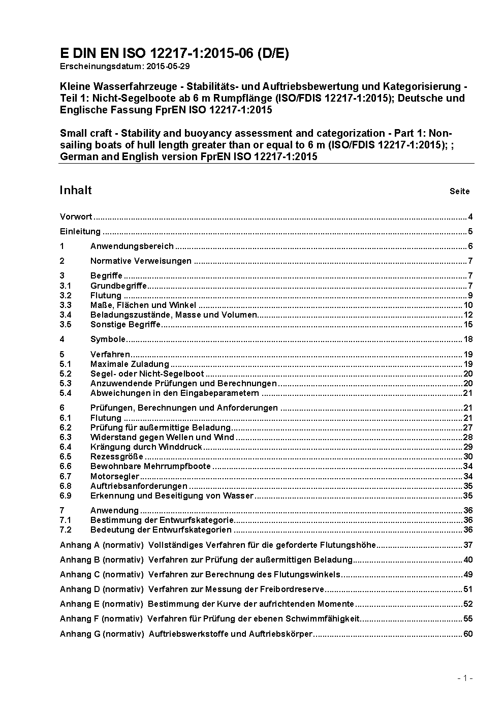 Small craft - Stability and buoyancy assessment and categorization - Part 1: Non-sailing boats of hull length greater than or equal to 6 m (ISO 12217-1:2015); German version EN ISO 12217-1:2015