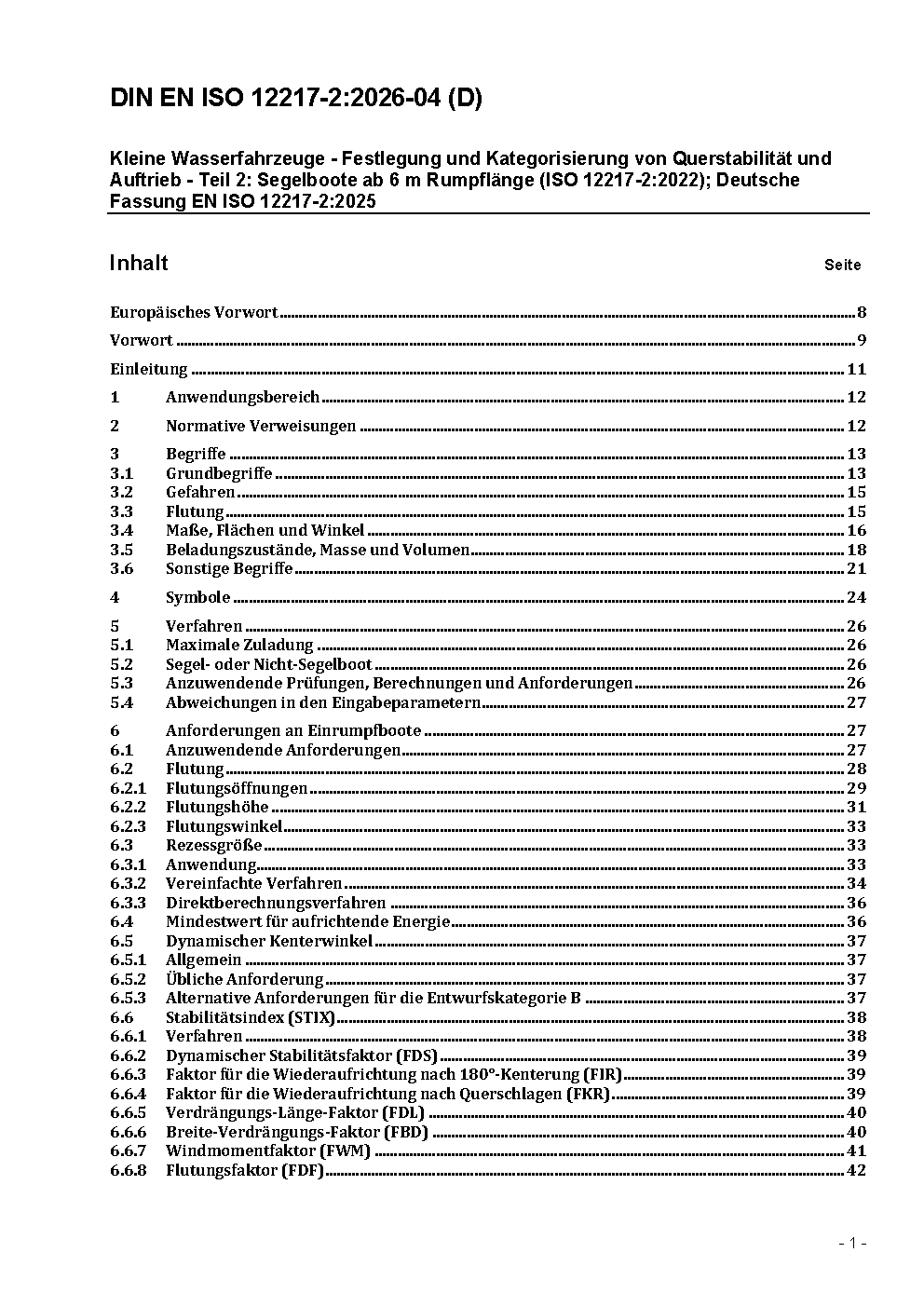 Kleine Wasserfahrzeuge - Stabilitäts- und Auftriebsbewertung und Kategorisierung - Teil 2: Segelboote ab 6 m Rumpflänge (ISO 12217-2:2015); Deutsche Fassung EN ISO 12217-2:2017; Änderung A100