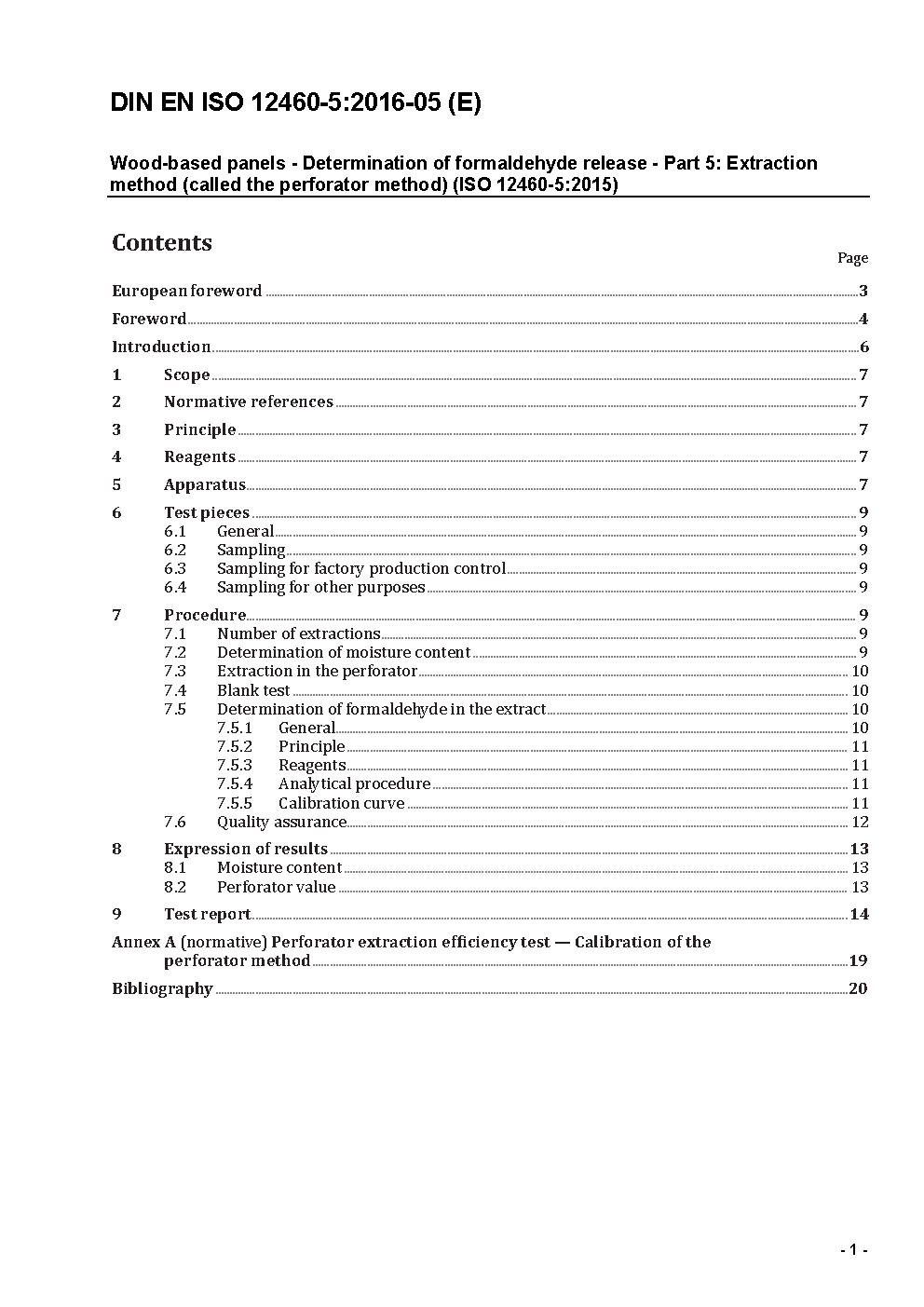 Holzwerkstoffe - Bestimmung der Formaldehydabgabe - Teil 5: Extraktionsverfahren (genannt Perforatormethode) (ISO 12460-5:2015); Deutsche Fassung EN ISO 12460-5:2015