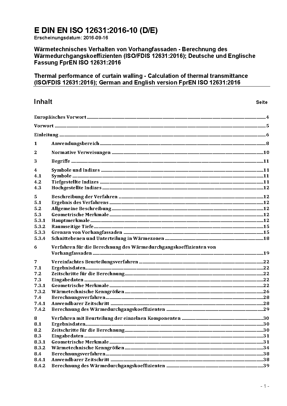 Wärmetechnisches Verhalten von Vorhangfassaden - Berechnung des Wärmedurchgangskoeffizienten (ISO/FDIS 12631:2016); Deutsche und Englische Fassung FprEN ISO 12631:2016