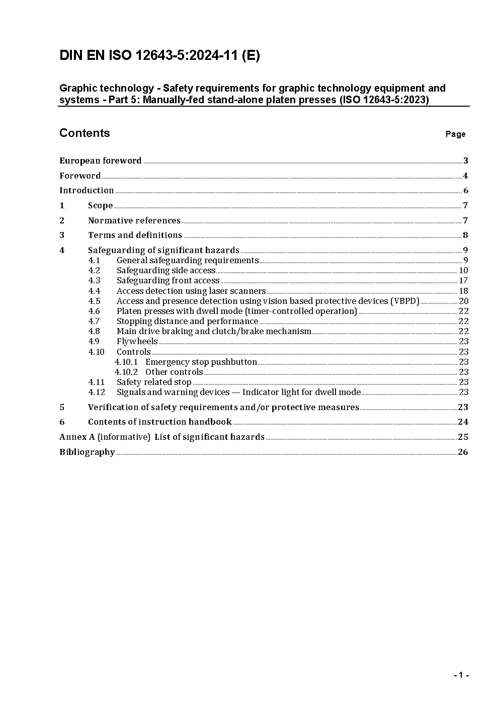 Graphische Technik - Sicherheitsanforderungen an Ausrüstungen und Systeme der graphischen Technik - Teil 5: Stand-alone-Stanztiegel mit manueller Anlage (ISO 12643-5:2023); Deutsche Fassung EN ISO 12643-5:2023