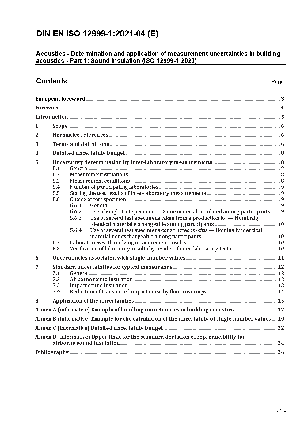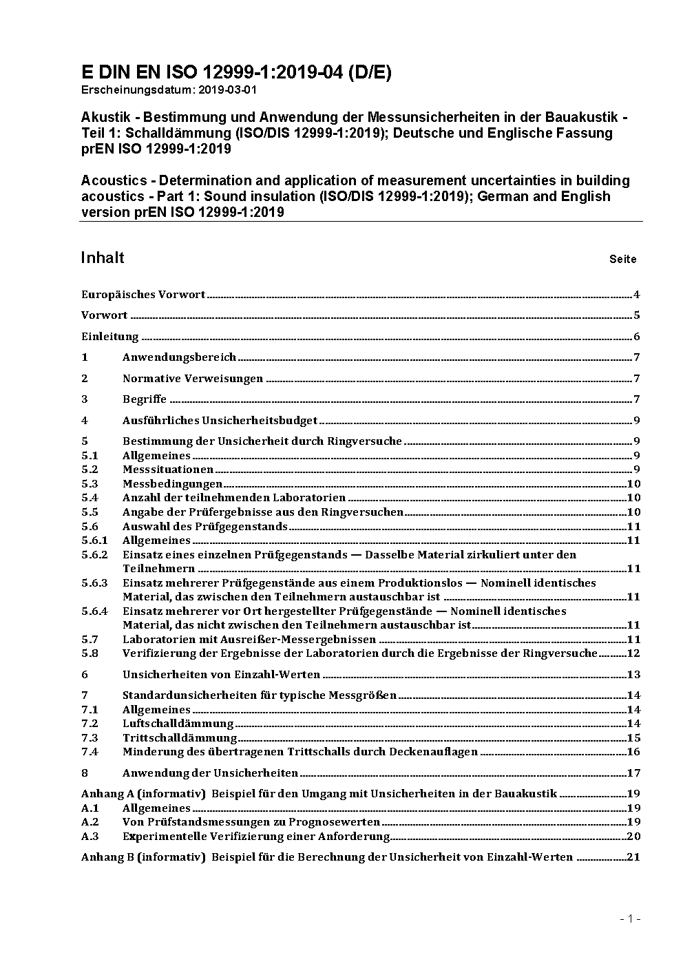 Acoustics - Determination and application of measurement uncertainties in building acoustics - Part 1: Sound insulation (ISO/DIS 12999-1:2019); German and English version prEN ISO 12999-1:2019