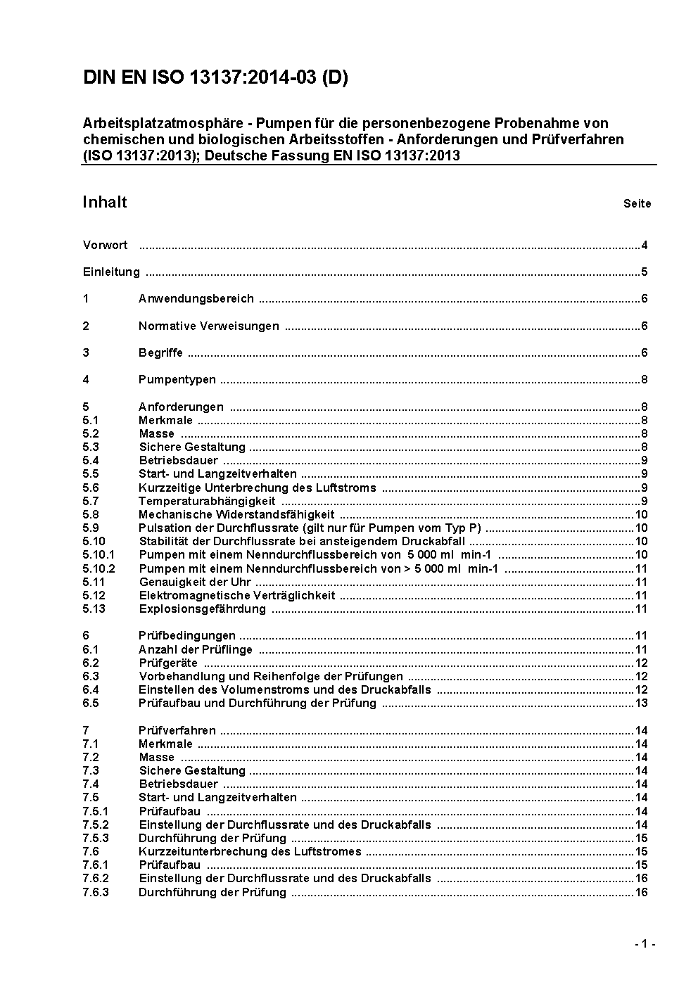 Arbeitsplatzatmosphäre - Pumpen für die personenbezogene Probenahme von chemischen und biologischen Arbeitsstoffen - Anforderungen und Prüfverfahren (ISO 13137:2013); Deutsche Fassung EN ISO 13137:2013