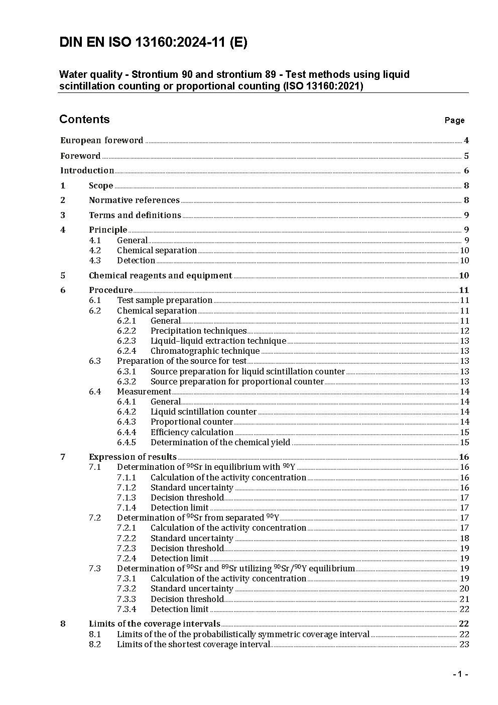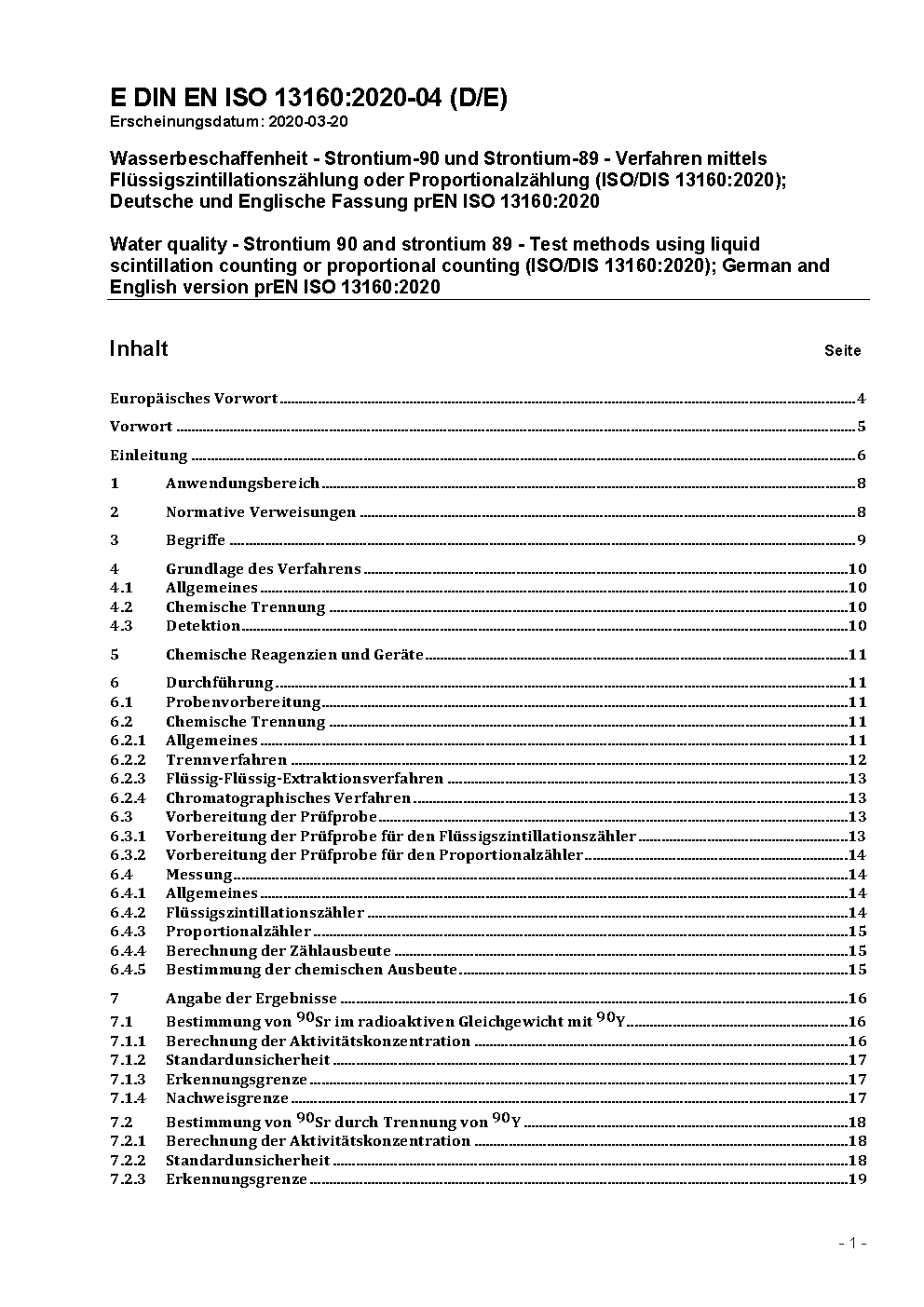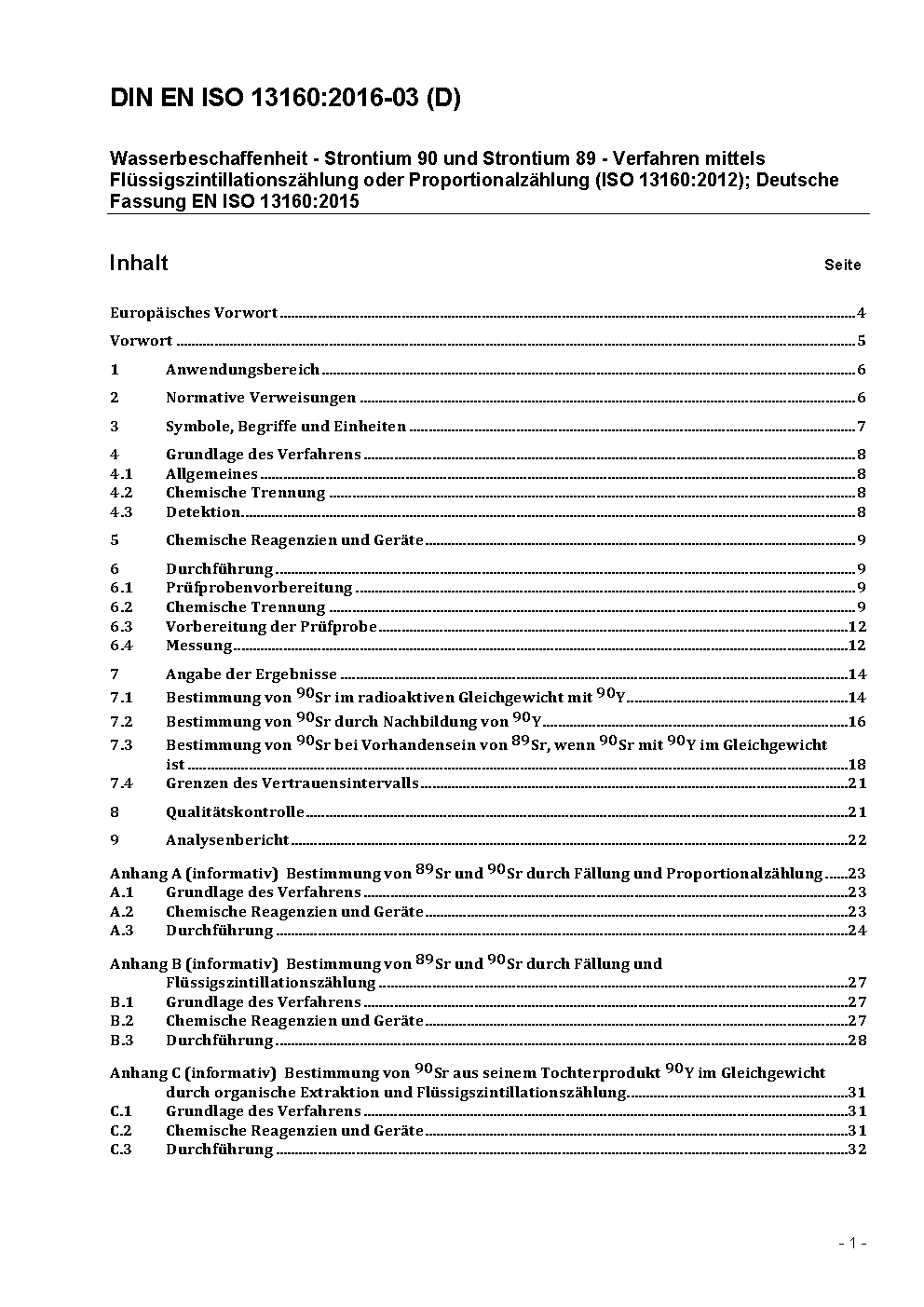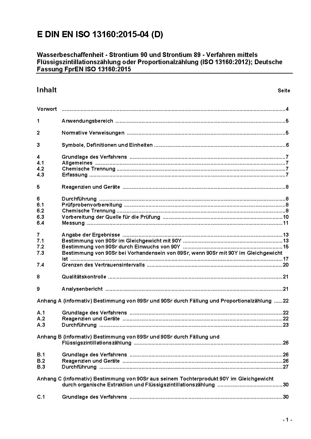 Wasserbeschaffenheit - Strontium 90 und Strontium 89 - Verfahren mittels Flüssigszintillationszählung oder Proportionalzählung (ISO 13160:2012); Deutsche Fassung EN ISO 13160:2015