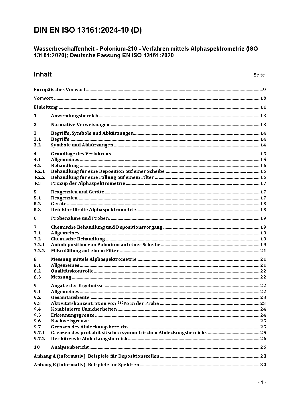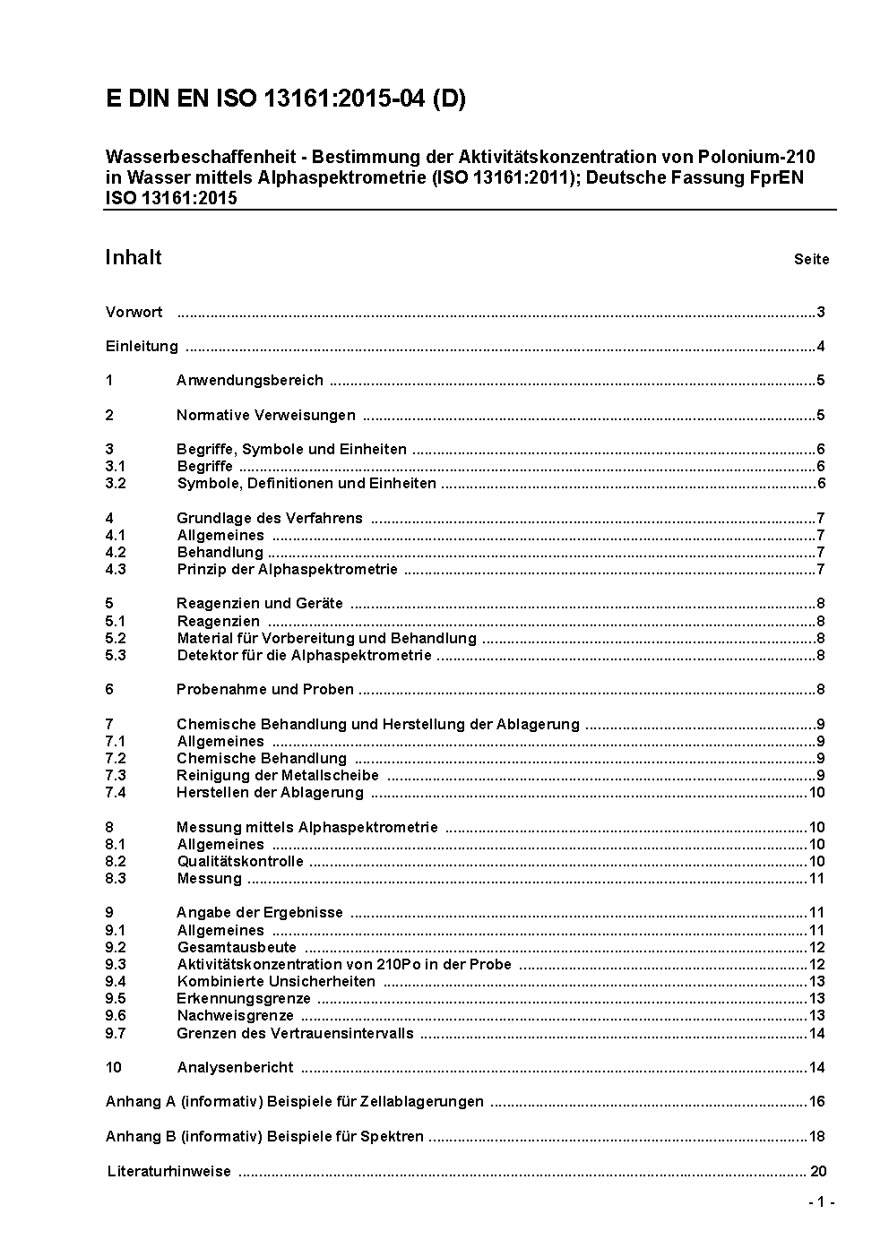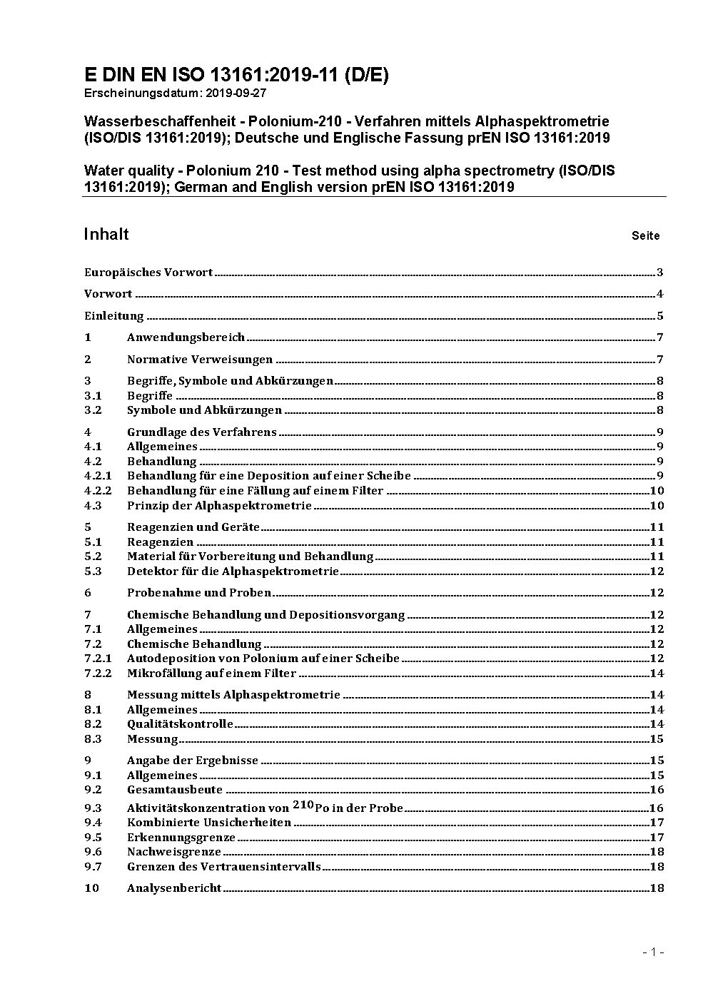 Water quality - Polonium 210 - Test method using alpha spectrometry (ISO/DIS 13161:2019); German and English version prEN ISO 13161:2019