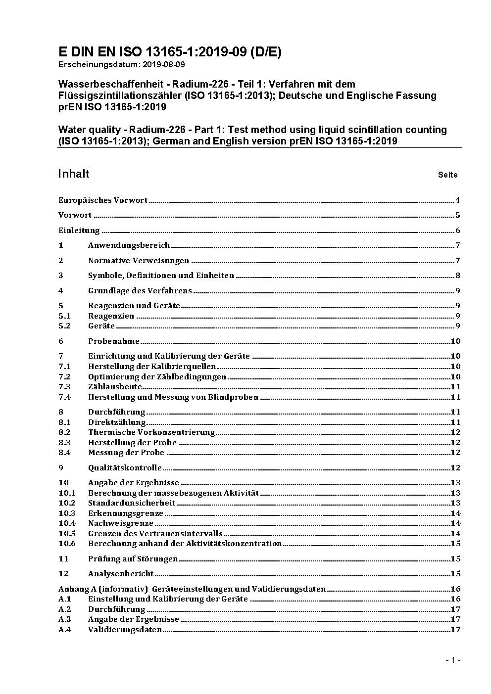 Wasserbeschaffenheit - Radium-226 - Teil 1: Verfahren mit dem Flüssigszintillationszähler (ISO 13165-1:2022); Deutsche und Englische Fassung prEN ISO 13165-1:2023