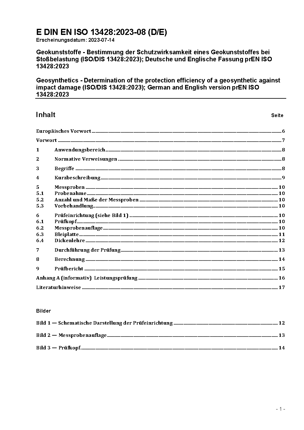 Geokunststoffe - Bestimmung der Schutzwirksamkeit eines Geokunststoffes bei Stoßbelastung (ISO/DIS 13428:2023); Deutsche und Englische Fassung prEN ISO 13428:2023