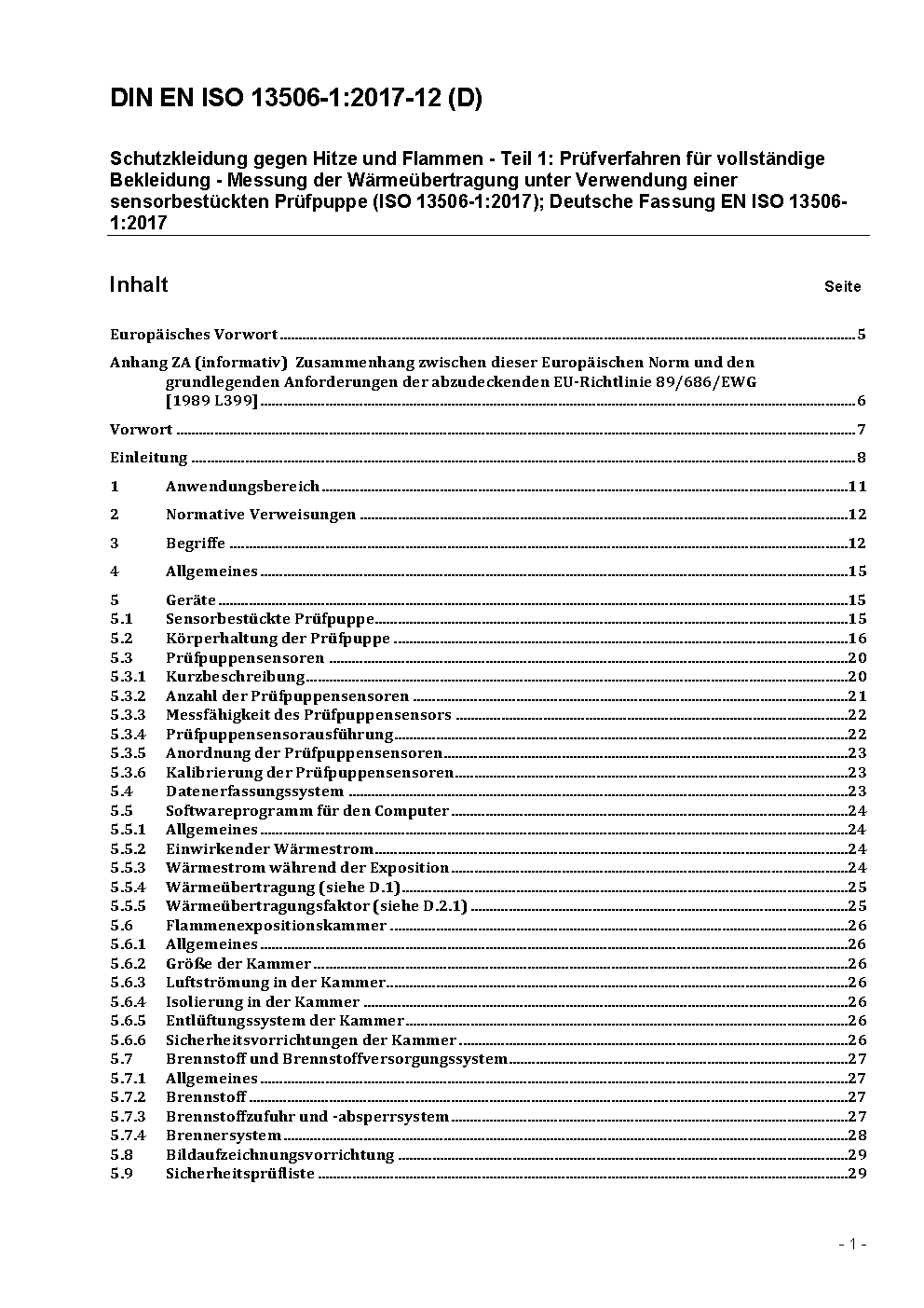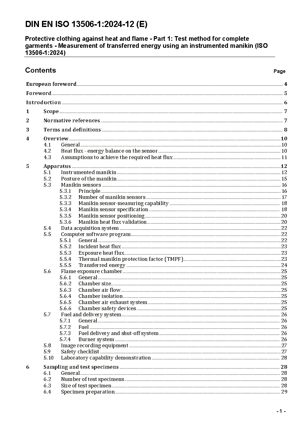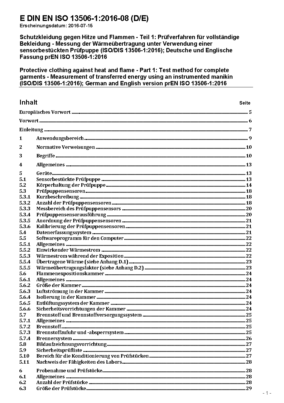 Protective clothing against heat and flame - Part 1: Test method for complete garments - Measurement of transferred energy using an instrumented manikin (ISO/DIS 13506-1:2023); German and English version prEN ISO 13506-1:2023