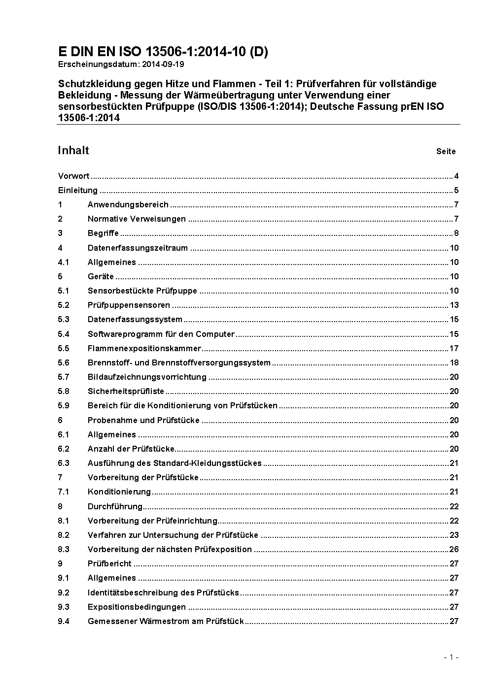 Schutzkleidung gegen Hitze und Flammen - Teil 1: Prüfverfahren für vollständige Bekleidung - Messung der Wärmeübertragung unter Verwendung einer sensorbestückten Prüfpuppe (ISO/DIS 13506-1:2023); Deutsche und Englische Fassung prEN ISO 13506-1:2023