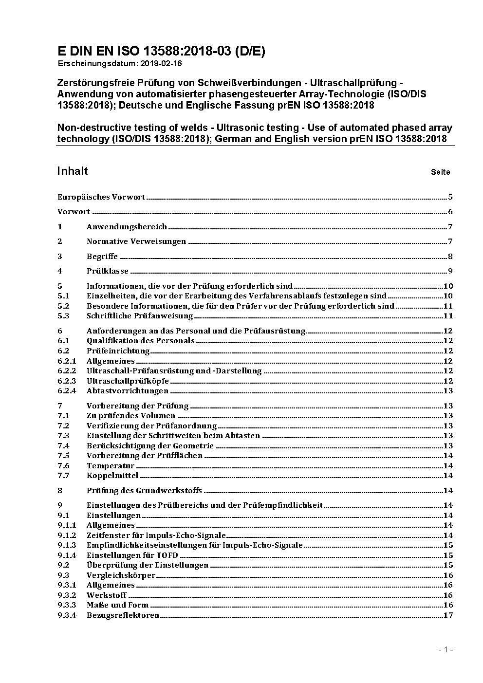 Zerstörungsfreie Prüfung von Schweißverbindungen - Ultraschallprüfung - Anwendung von automatisierter phasengesteuerter Array-Technologie (ISO/DIS 13588:2018); Deutsche und Englische Fassung prEN ISO 13588:2018
