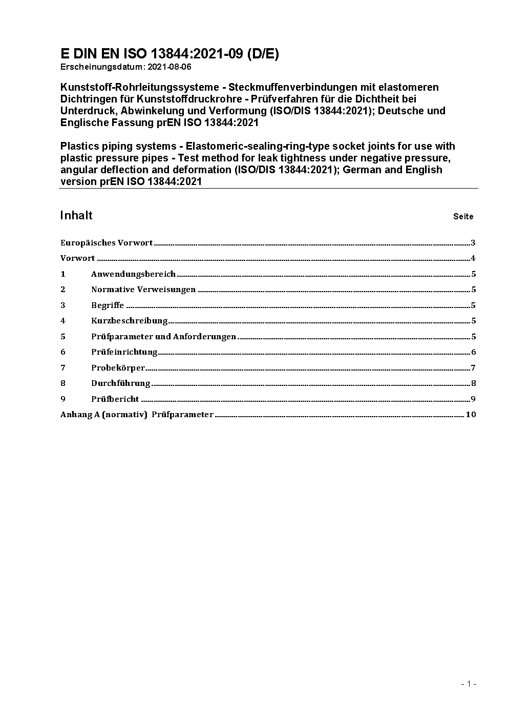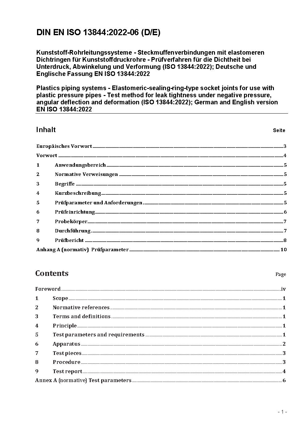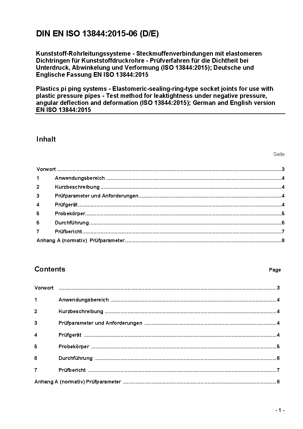 Kunststoff-Rohrleitungssysteme - Steckmuffenverbindungen aus weichmacherfreiem Polyvinylchlorid (PVC-U) mit elastomeren Dichtringen für PVC-U-Rohre - Prüfverfahren für die Dichtheit bei Unterdruck (ISO 13844:2000); Deutsche Fassung EN ISO 13844:2000