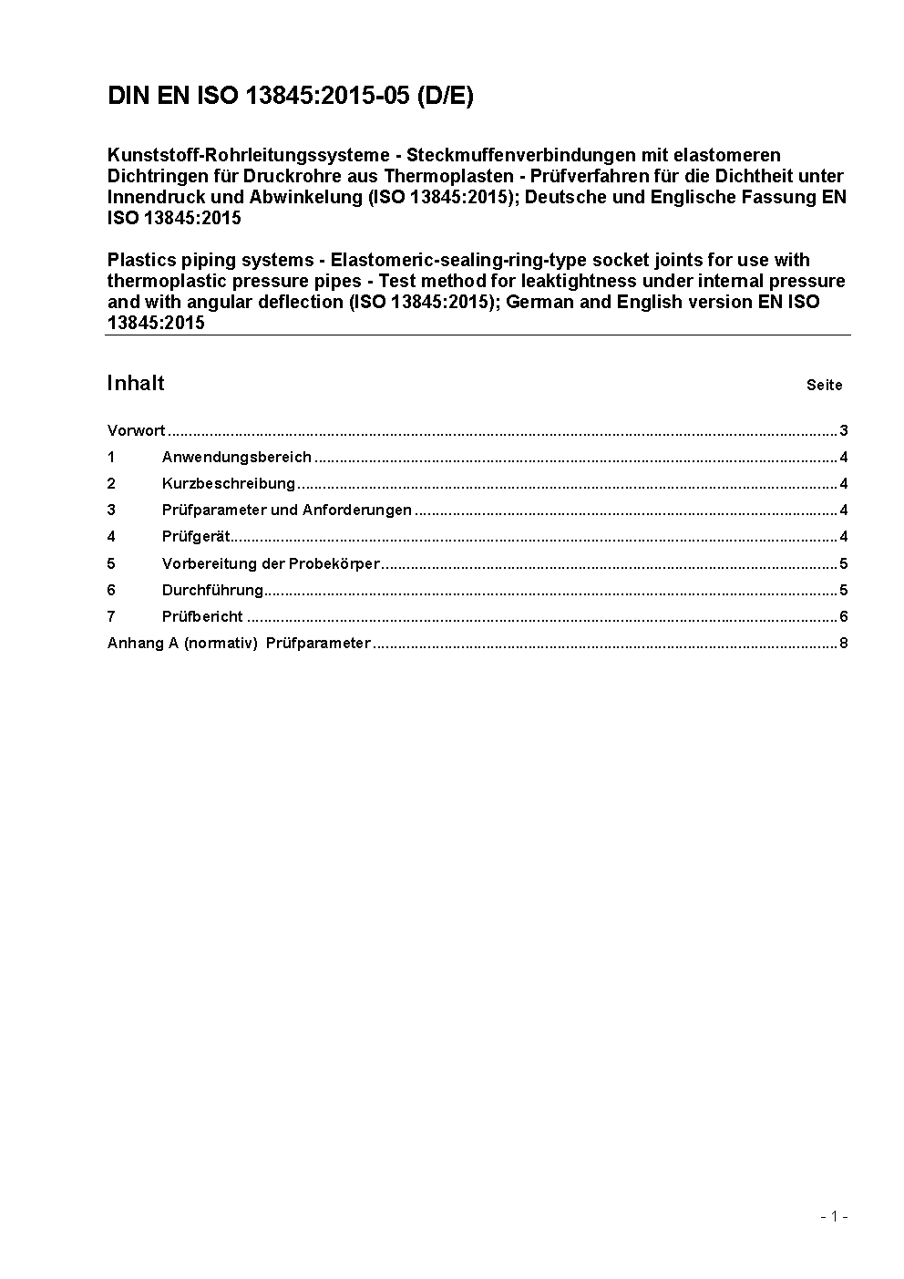 Plastics pipes systems - Elastomeric-sealing-ring-type socket joints for use with unplasticized poly(vinyl chloride) (PVC-U) pipes - Test method for leaktightness under internal pressure and with angular deflection (ISO 13845:2000); German version EN ISO 13845:2000