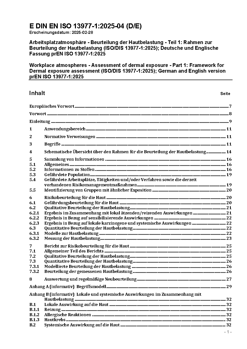 Arbeitsplatzatmosphäre - Beurteilung der Hautbelastung - Teil 1: Rahmen zur Beurteilung der Hautbelastung (ISO/DIS 13977-1:2025); Deutsche und Englische Fassung prEN ISO 13977-1:2025