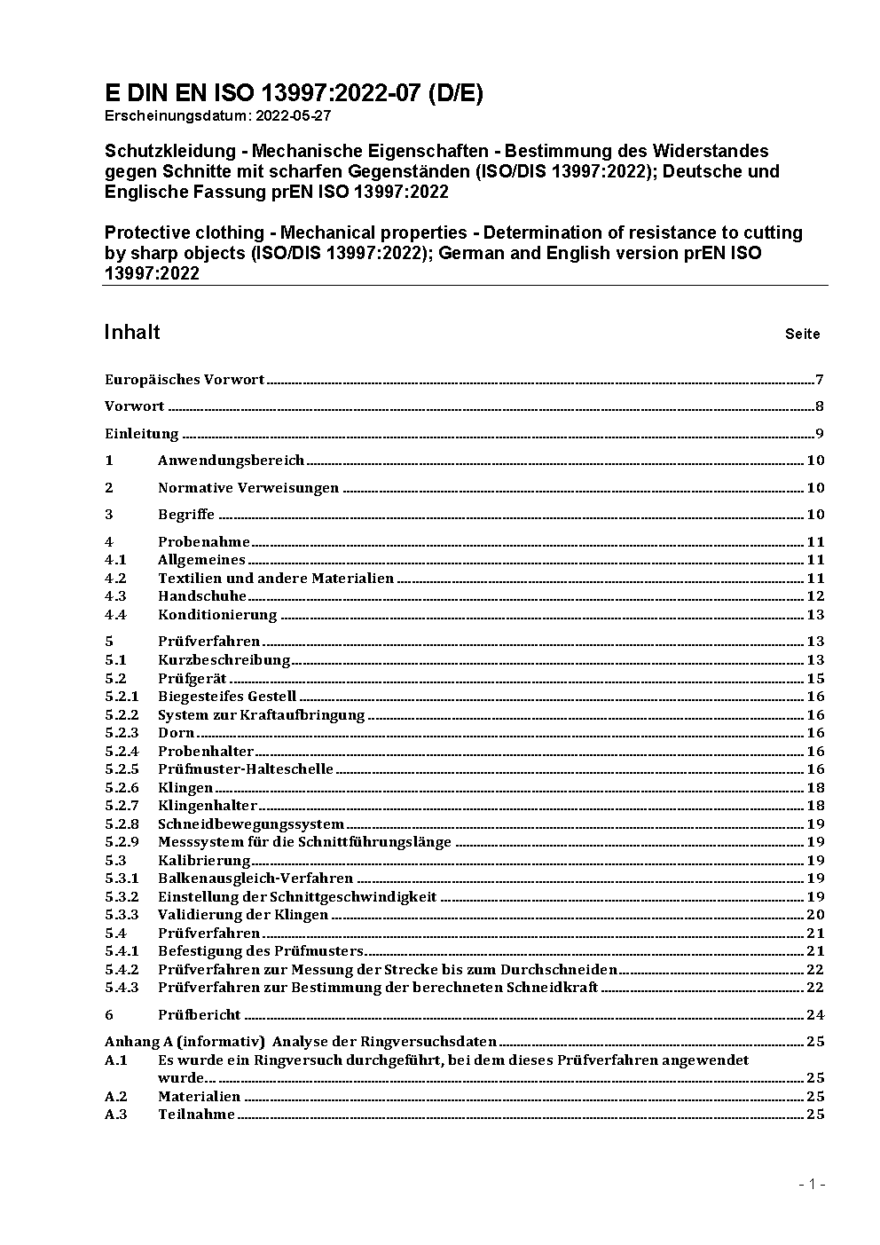 Schutzkleidung - Mechanische Eigenschaften - Bestimmung des Widerstandes gegen Schnitte mit scharfen Gegenständen (ISO/DIS 13997:1997); Deutsche Fassung prEN ISO 13997:1997