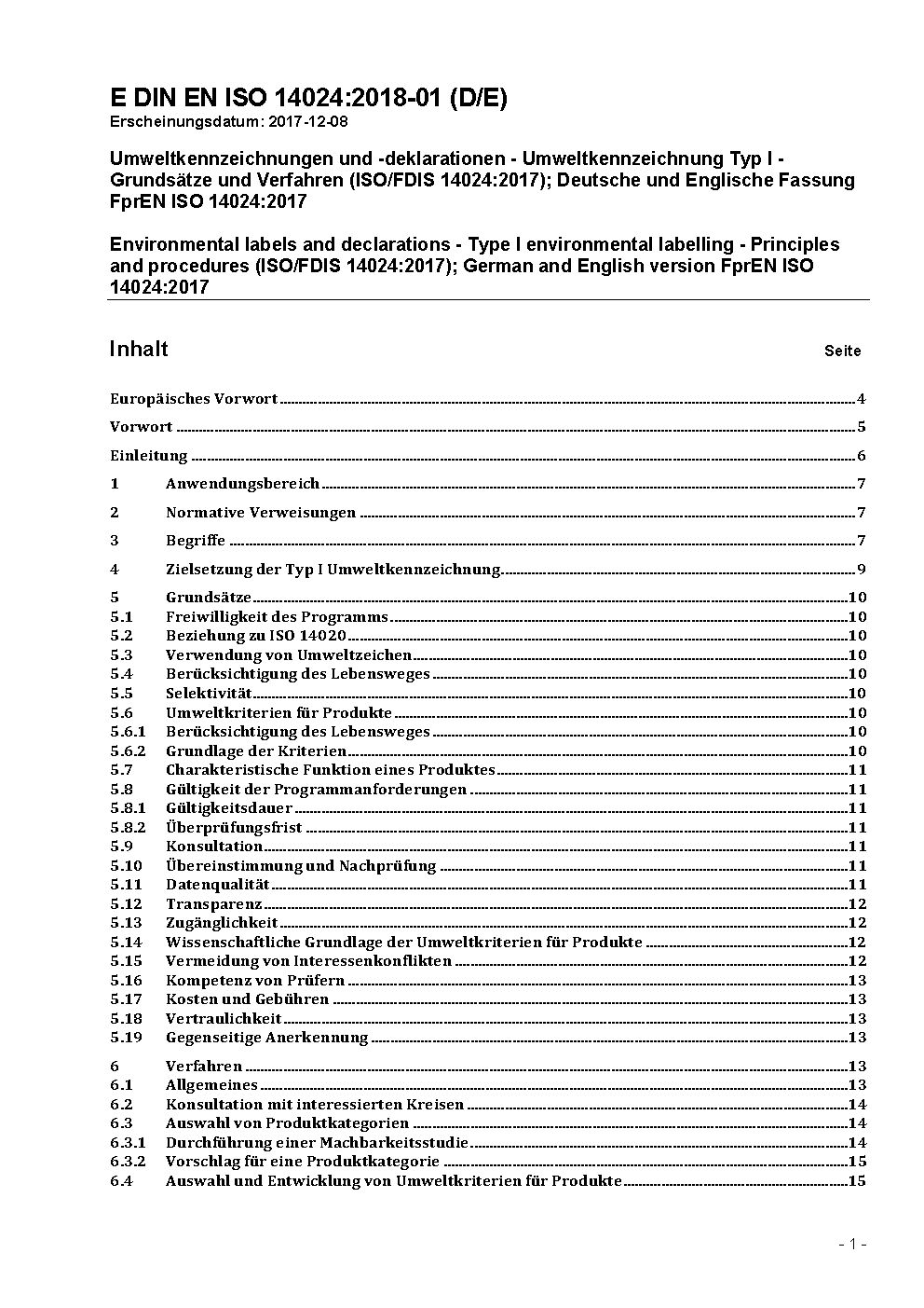 Environmental labels and declarations - Type I environmental labelling - Principles and procedures (ISO 14024:1999/DAM 1:2015); German and English version EN ISO 14024:2000/prA1:2015