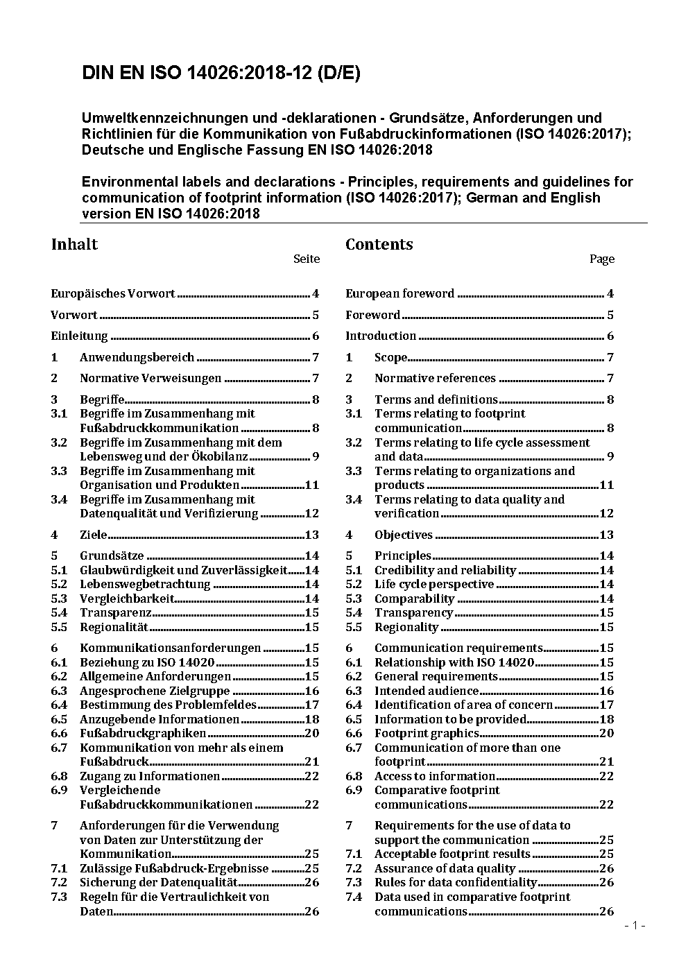 Environmental labels and declarations - Principles, requirements and guidelines for communication of footprint information (ISO 14026:2017); German and English version prEN ISO 14026:2018