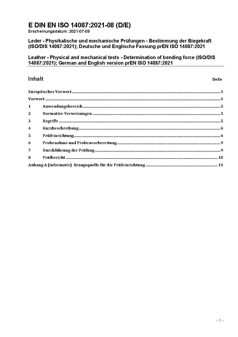 Leder - Physikalische und mechanische Prüfungen - Bestimmung der Biegekraft (ISO 14087:2011); Deutsche Fassung EN ISO 14087:2011
