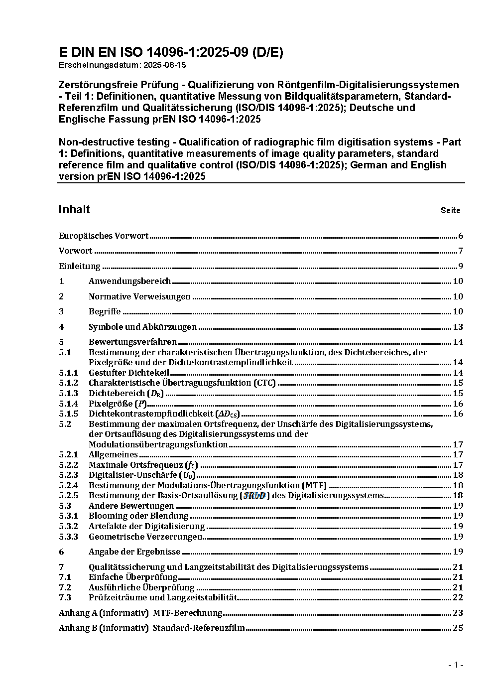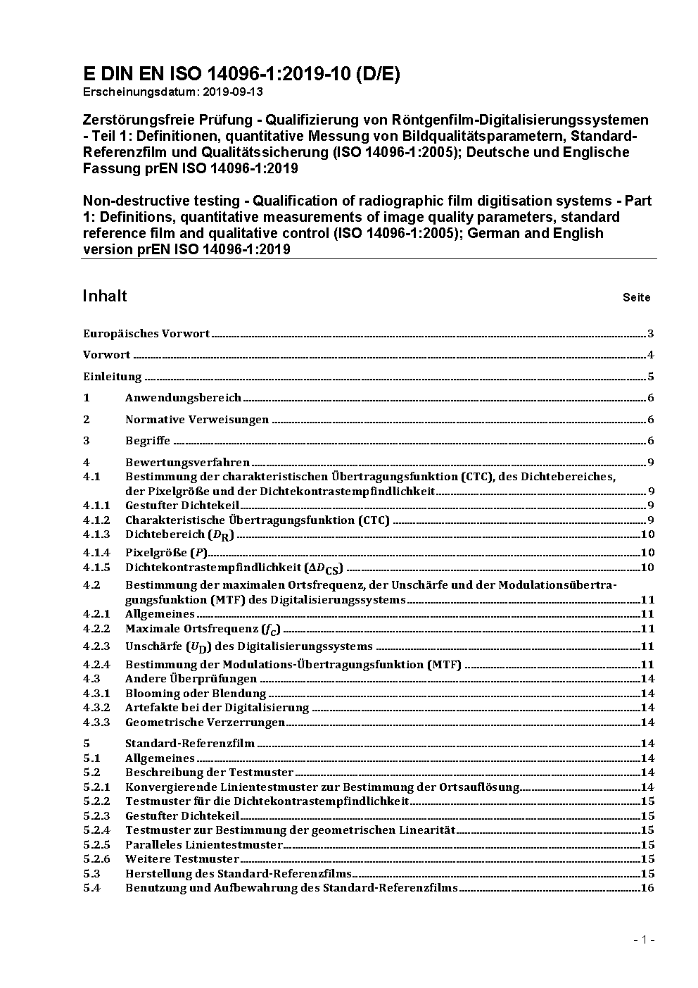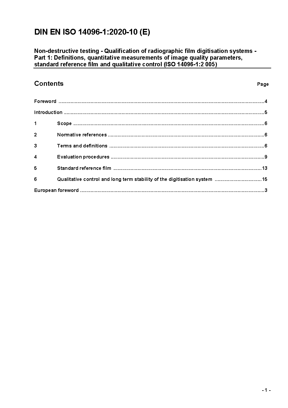 Non-destructive testing - Qualification of radiographic film digitisation systems - Part 1: Definitions, quantitative measurements of image quality parameters, standard reference film and qualitative control (ISO 14096-1:2005); German version EN ISO 14096-1:2020