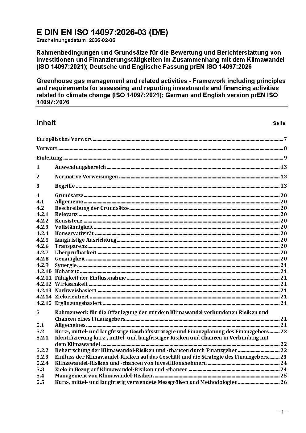Rahmenbedingungen und Grundsätze für die Bewertung und Berichterstattung von Investitionen und Finanzierungstätigkeiten im Zusammenhang mit dem Klimawandel (ISO 14097:2021); Deutsche und Englische Fassung prEN ISO 14097:2026