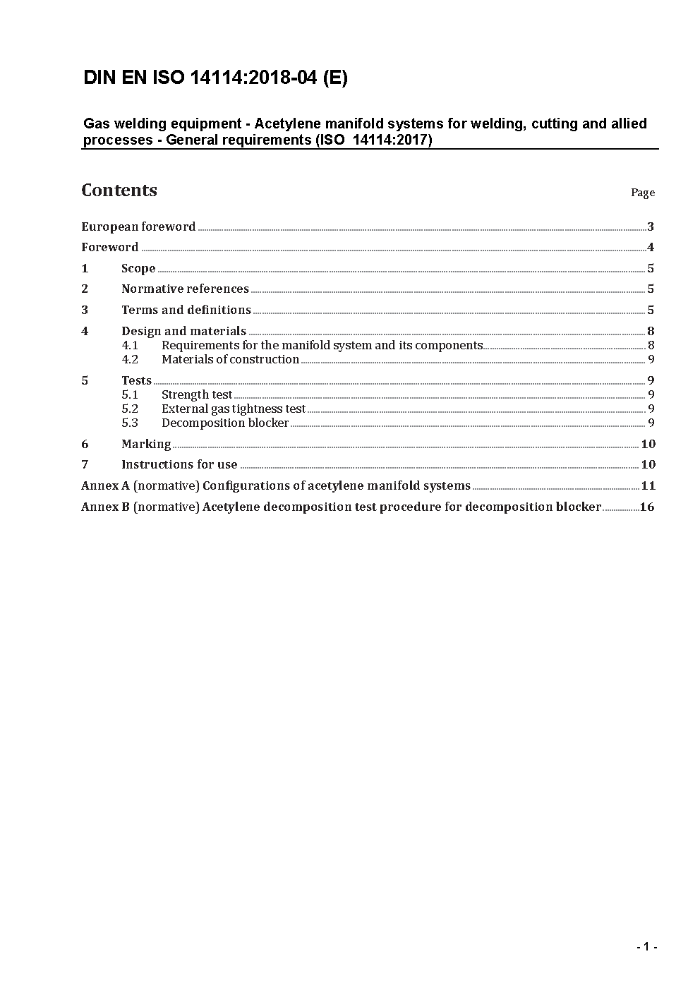 Gas welding equipment - Acetylene manifold systems for welding, cutting and allied processes - General requirements (ISO 14114:2017); German version EN ISO 14114:2018