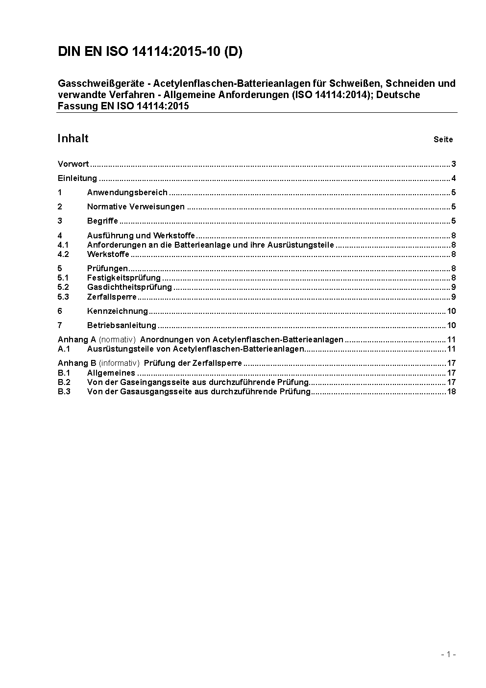 Gasschweißgeräte - Acetylenflaschen-Batterieanlagen für Schweißen, Schneiden und verwandte Verfahren - Allgemeine Anforderungen (ISO 14114:2017); Deutsche Fassung EN ISO 14114:2018