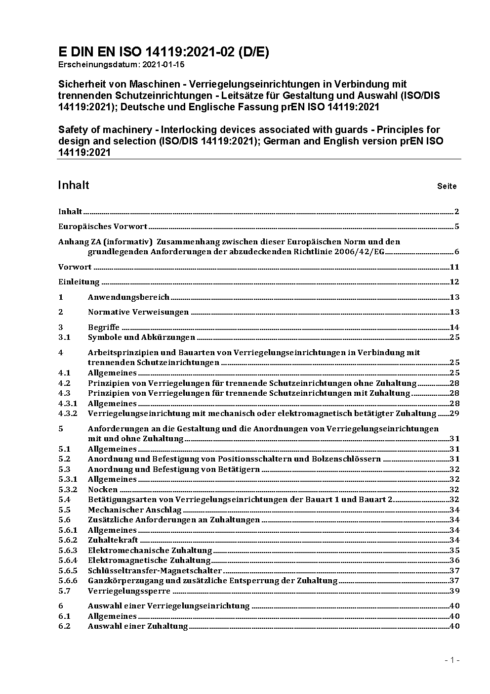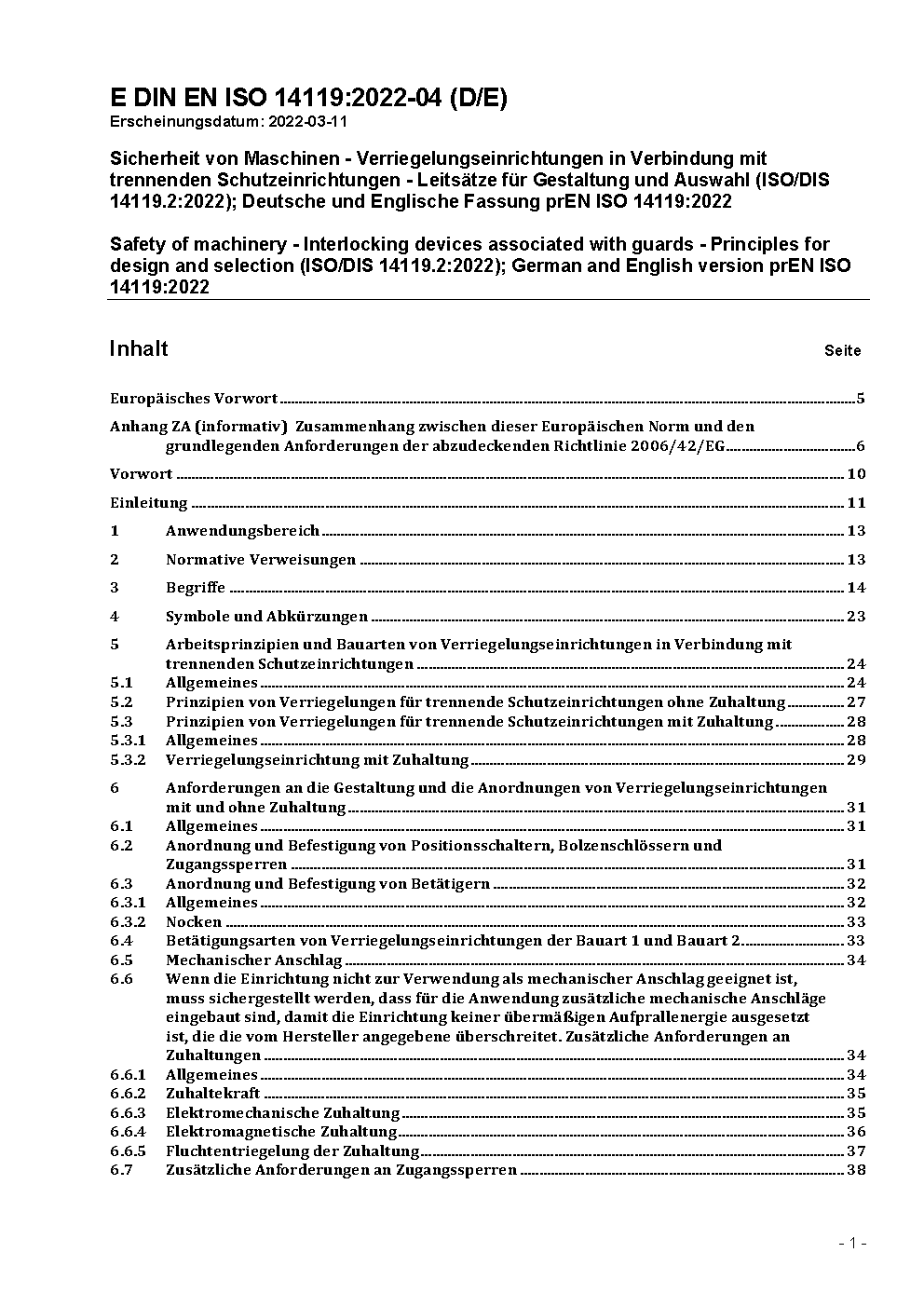 Sicherheit von Maschinen - Verriegelungseinrichtungen in Verbindung mit trennenden Schutzeinrichtungen - Leitsätze für Gestaltung und Auswahl (ISO/DIS 14119:2011); Deutsche Fassung prEN ISO 14119:2011