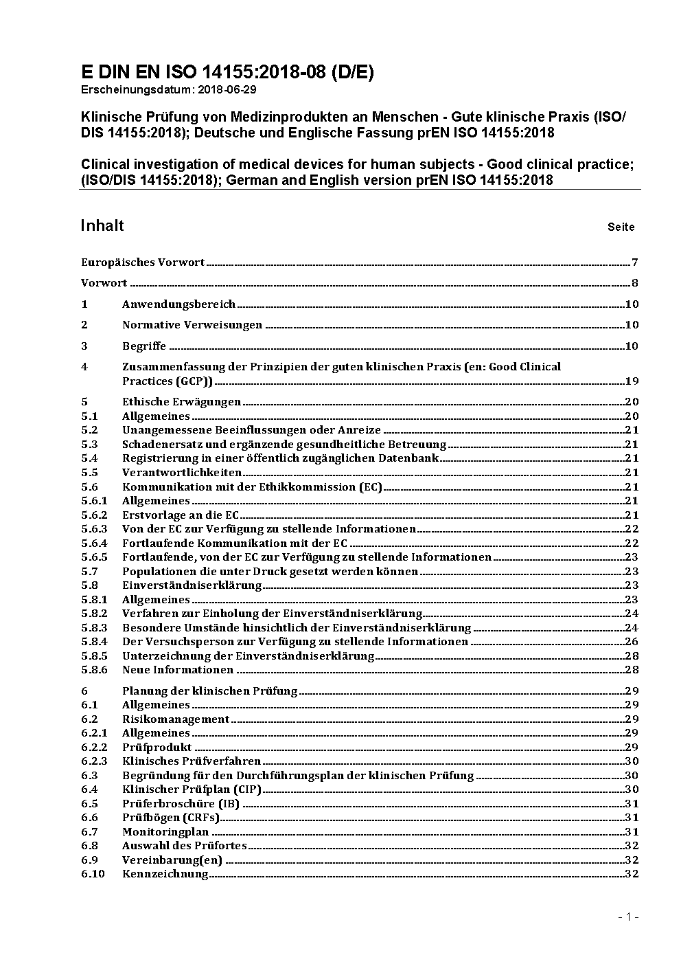 Clinical investigation of medical devices for human subjects - Good clinical practice (ISO/DIS 14155:2018); German and English version prEN ISO 14155:2018