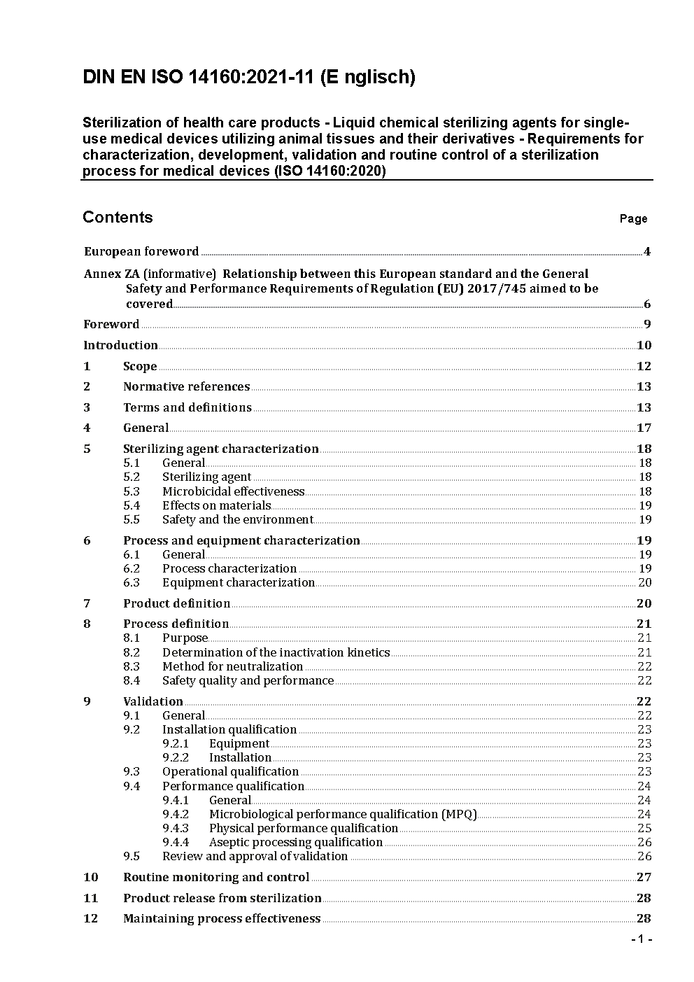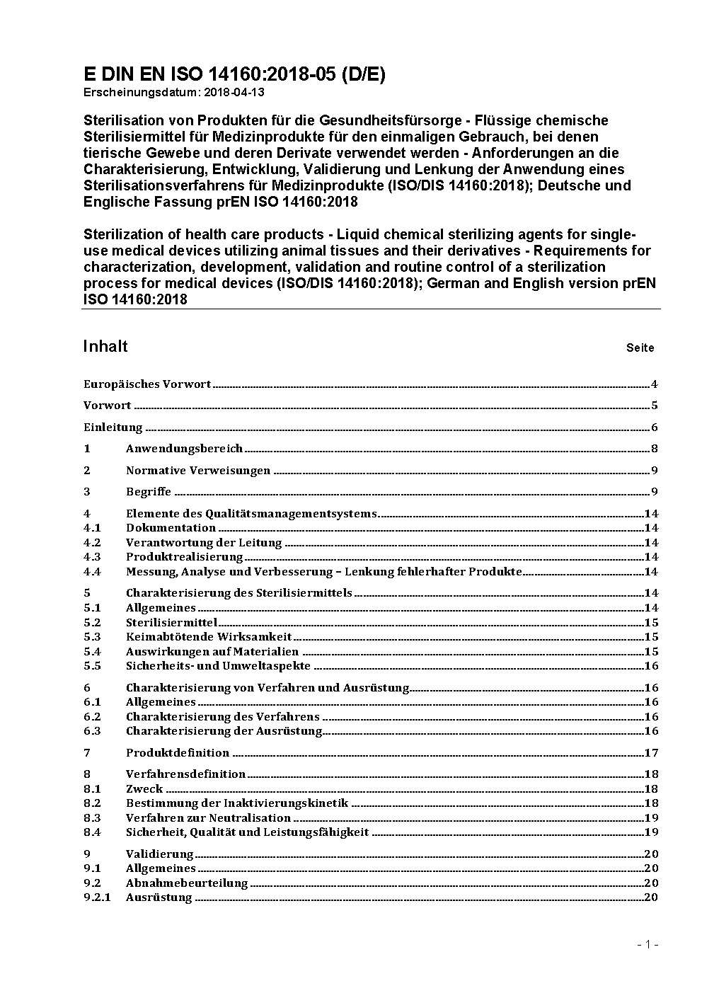 Sterilization of health care products - Liquid chemical sterilizing agents for single-use medical devices utilizing animal tissues and their derivatives - Requirements for characterization, development, validation and routine control of a sterilization process for medical devices (ISO/DIS 14160:2018); German and English version prEN ISO 14160:2018