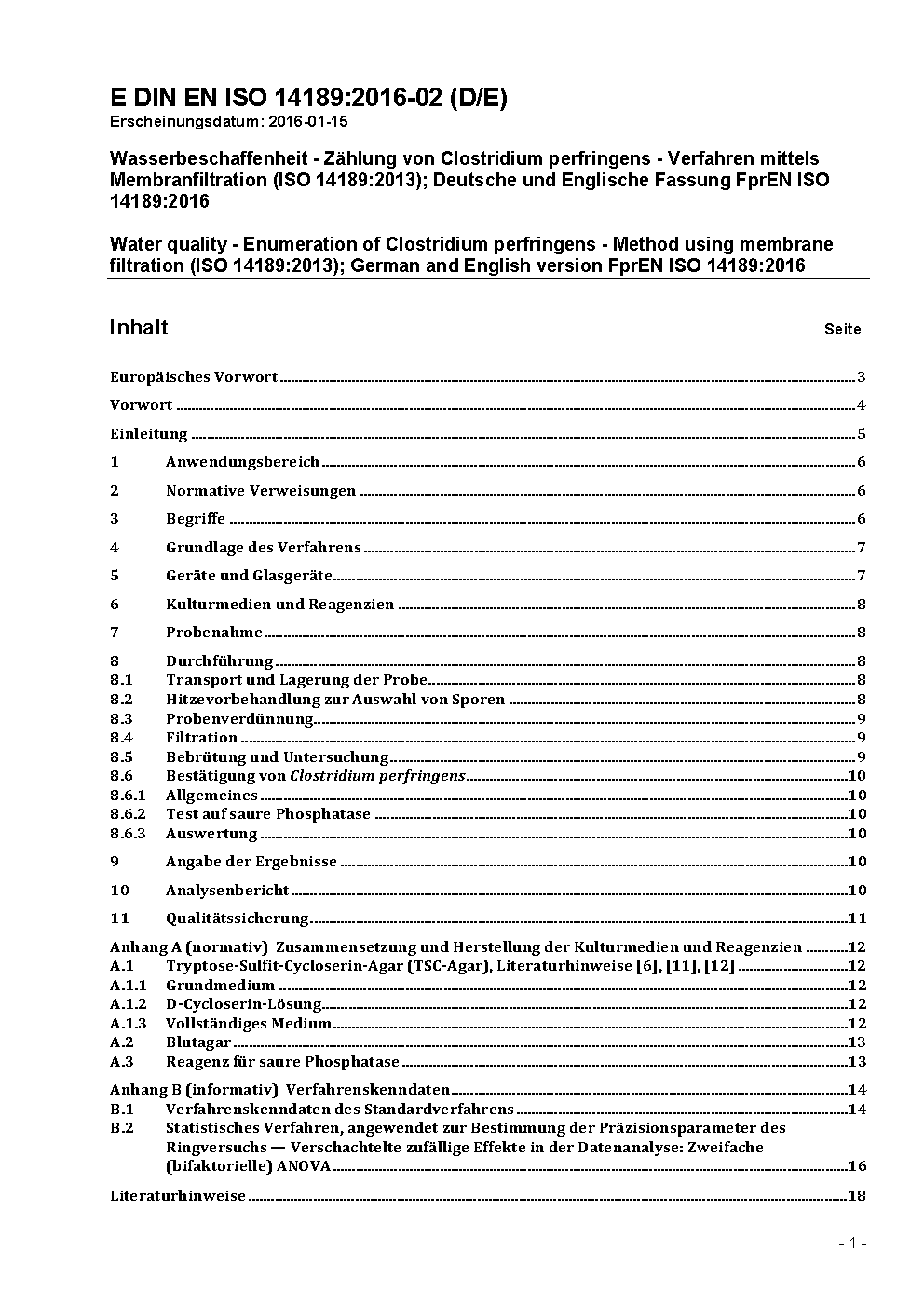 Wasserbeschaffenheit - Zählung von Clostridium perfringens - Verfahren mittels Membranfiltration (ISO 14189:2013); Deutsche und Englische Fassung FprEN ISO 14189:2016